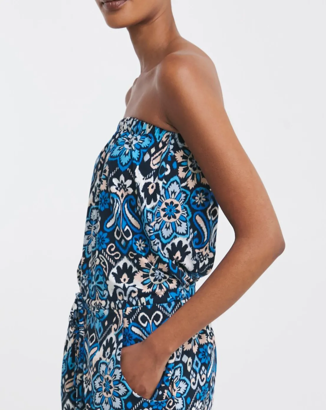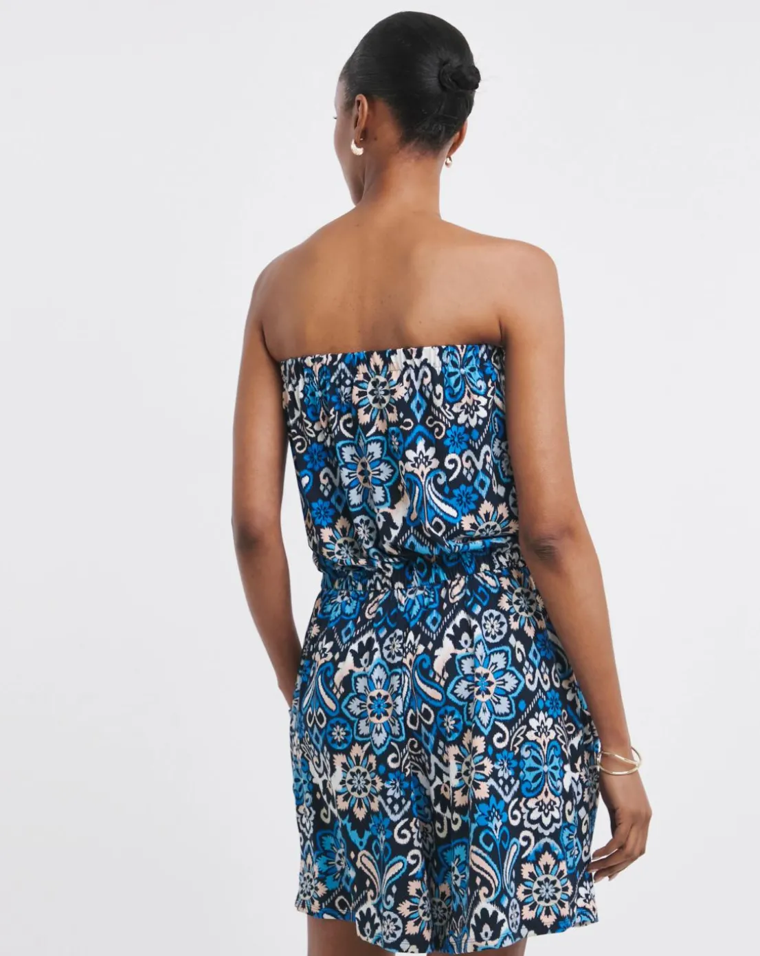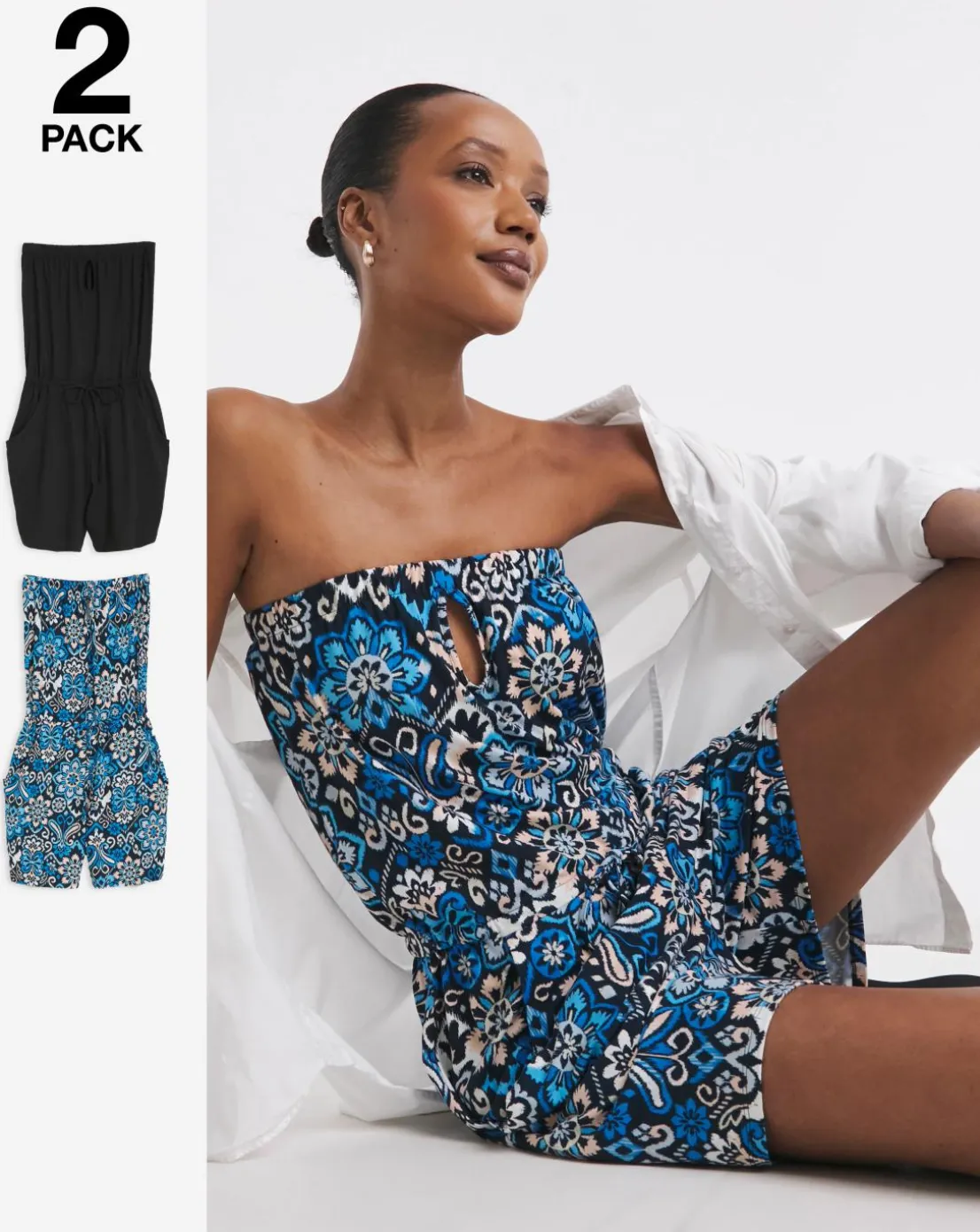 Our great value 2 pack playsuits come in a blue print and solid black , bringing you two playsuits for the price of one! The playsuits feature a bandeau neckline to expose the decolletage and is fitted with elastic and a drawstring, bringing femininity and comfort to the heart of our design