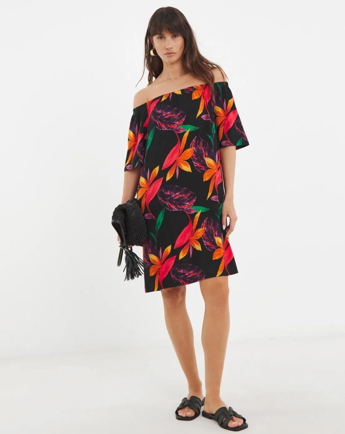 Our great value 2 pack bardot dresses come in the colours black and tropical print! The dresses sport a shorter length and are a relaxed fit, making them an easy throw on for the upcoming warmer months. The length falls to 37 inches.