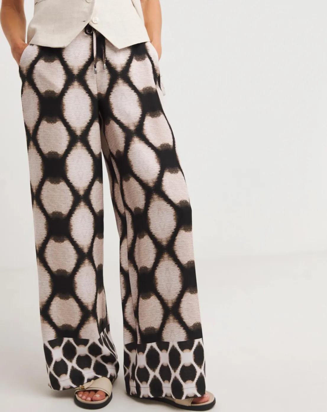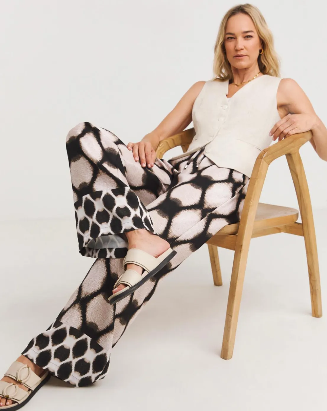 Our herringbone wide leg trouser is the perfect smart casual trouser. In a lightweight animal print fabric. Pair with sandals and a plain tee for an effortless look.