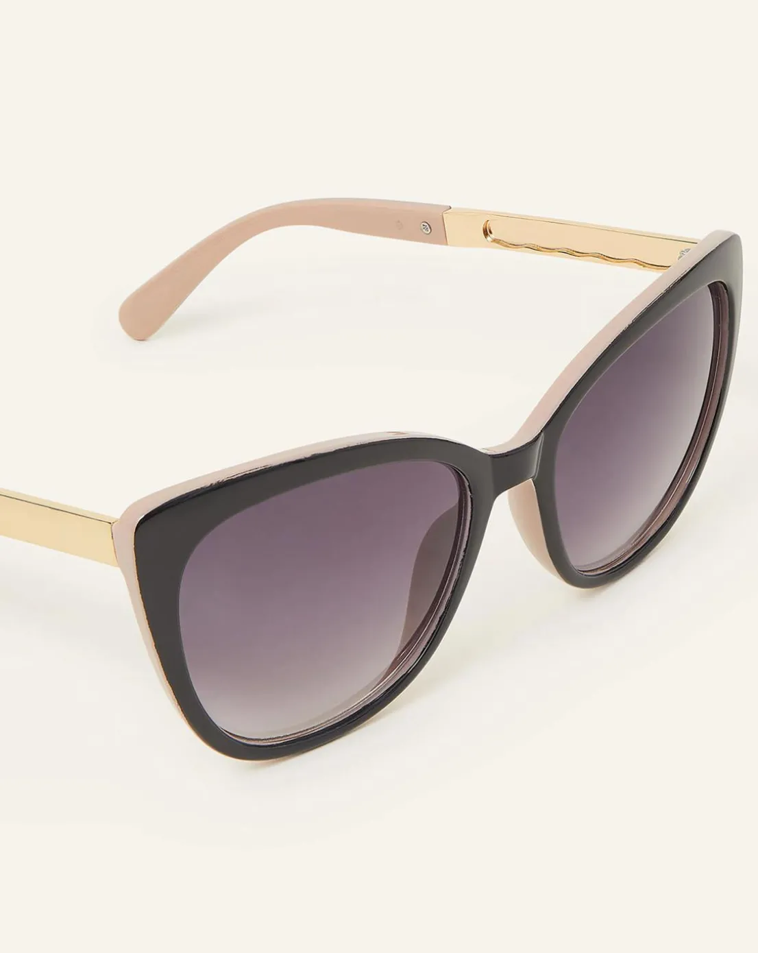 - Purely chic and ready to soak up the sun, these sunglasses celebrate the classic cat-eye silhouette. This pair features thick black frames with contrast neutral detailing.This pair offers maximum UV protection, protecting your eyes from UVA & UVB rays.