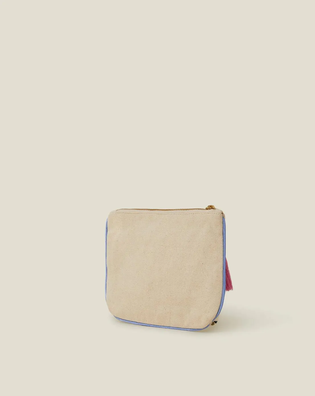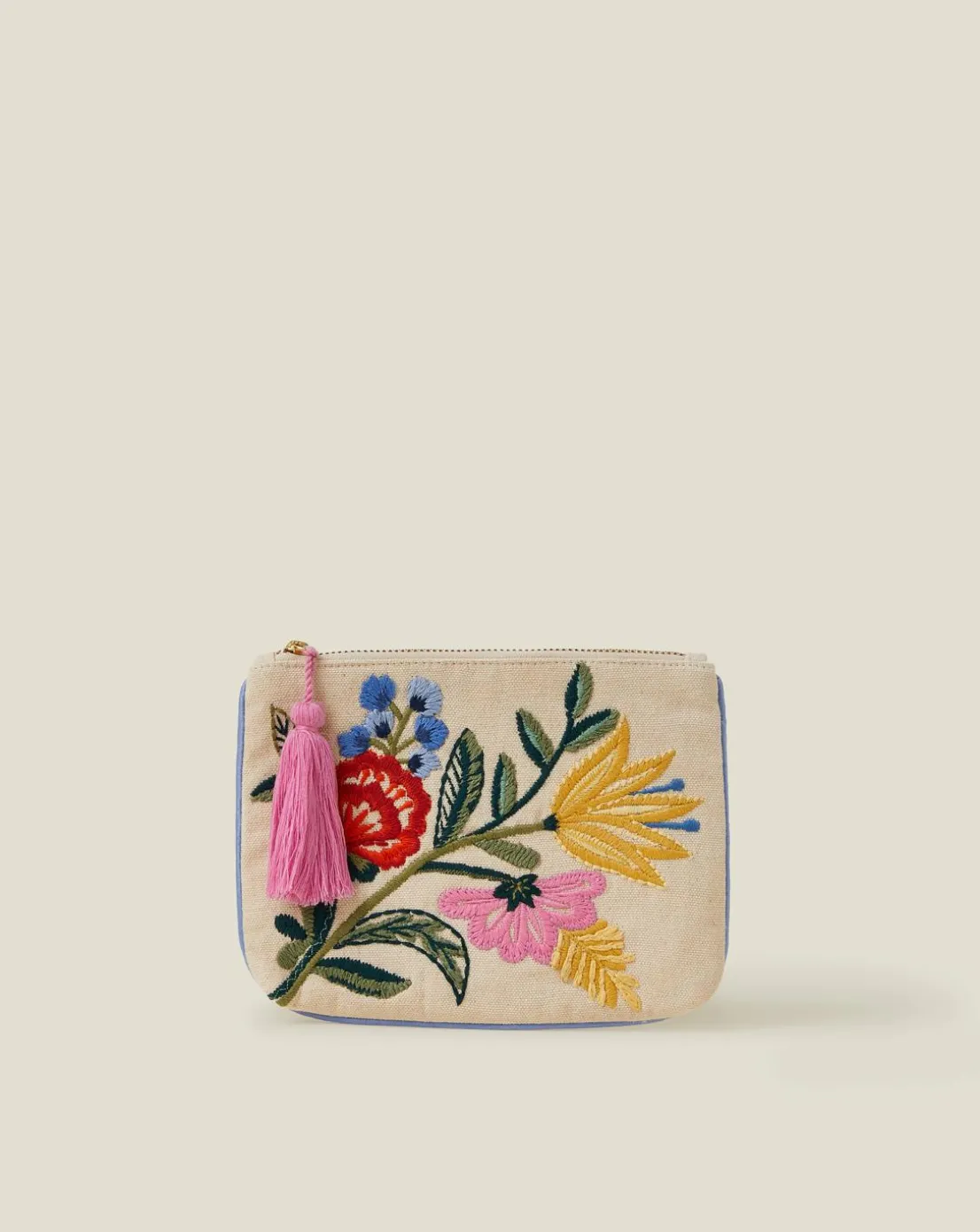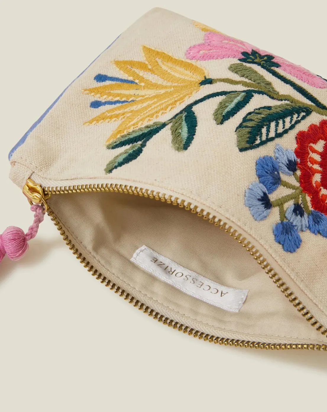 - From city breaks to overnight stays, this pouch is an absolute essential. It’s designed in gentle canvas, with embroidered florals and a zip tassel fastening.