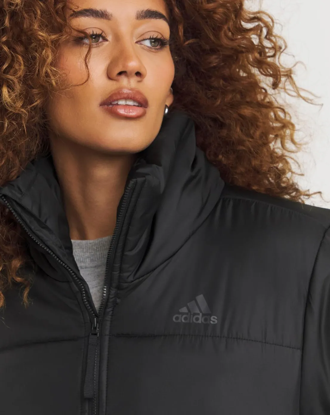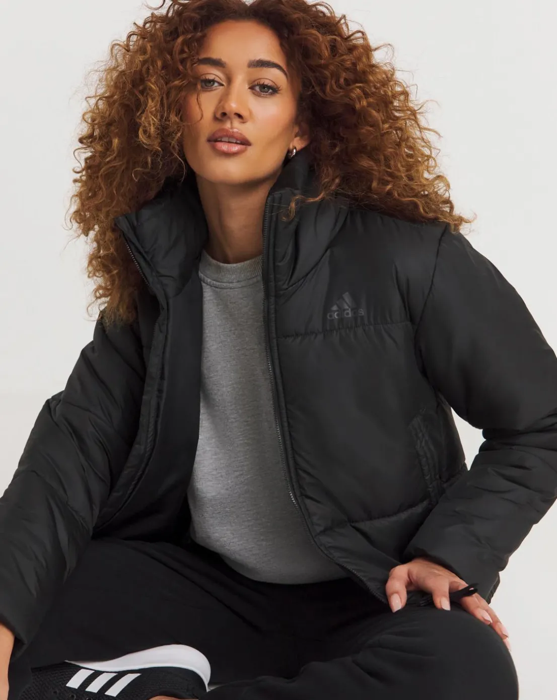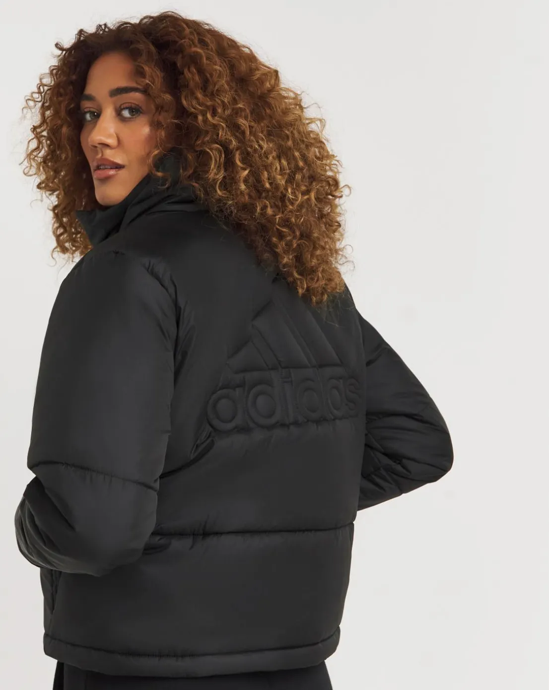 Stay warm without compromising your style. This adidas puffy jacket has a loose, relaxed fit and slightly shorter cut for a modern look that goes with everything. Large baffles and synthetic insulation seal in heat to keep you warm on cold winter days. Elastic cuffs and an adjustable hem seal in heat for a cosy feel on cold days. Zip pockets keep hands warm and your keys or phone within easy reach.