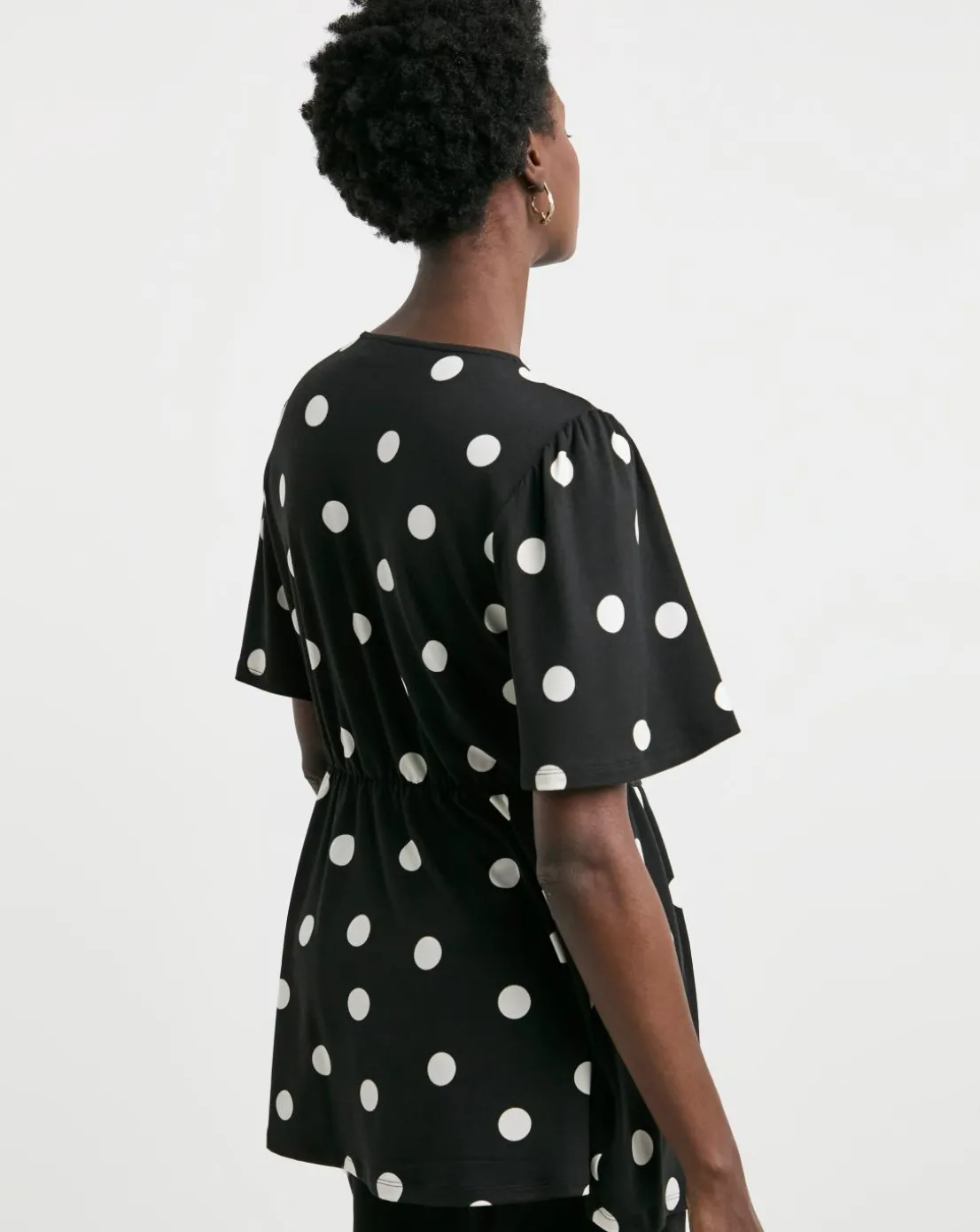 Our button front angel sleeve tops are a wardrobe essential. In a soft, stretchy jersey and longline shape, it’s a comfortable piece for every day. Pair this blue print with jeans or shorts for a casual, summer time look.