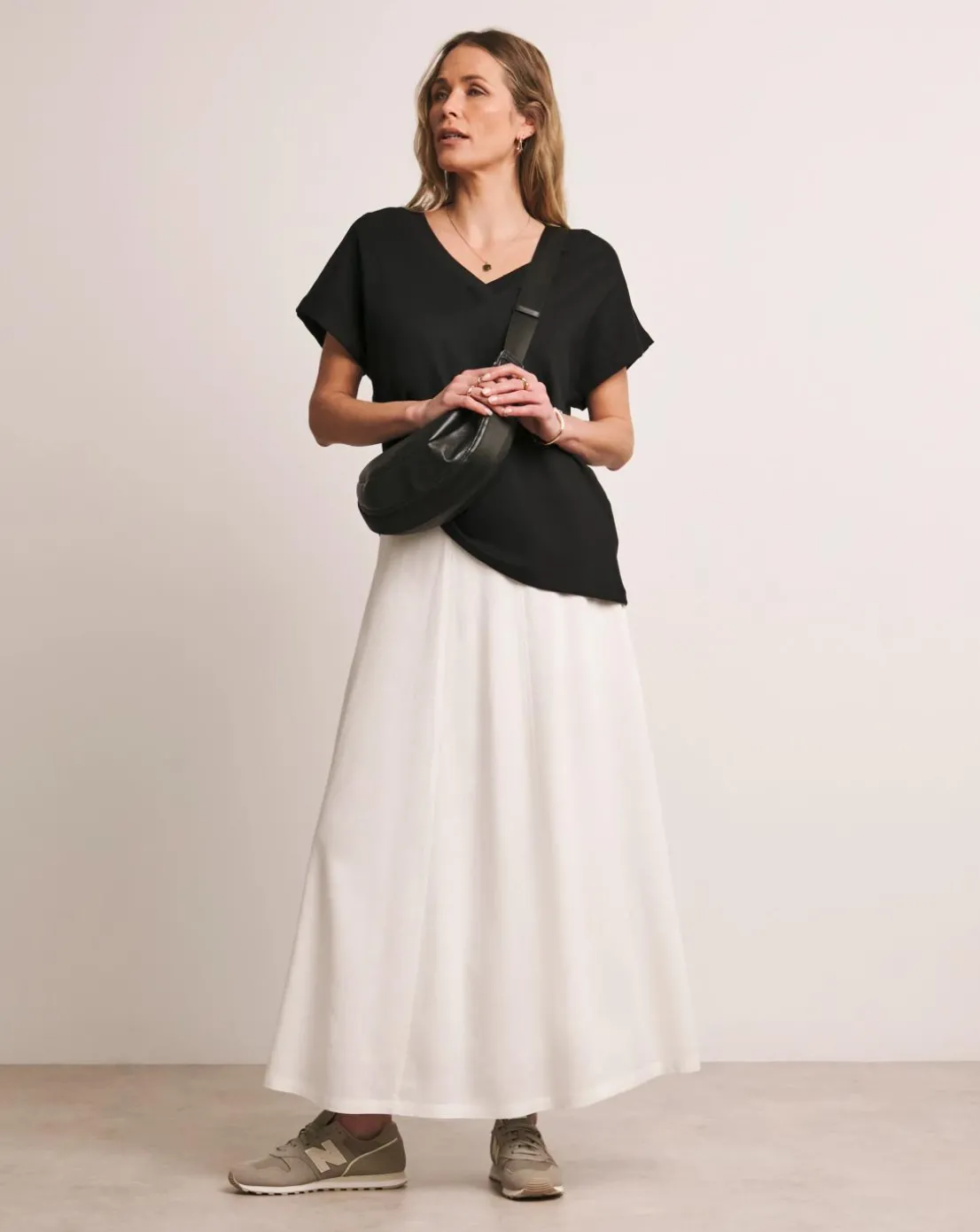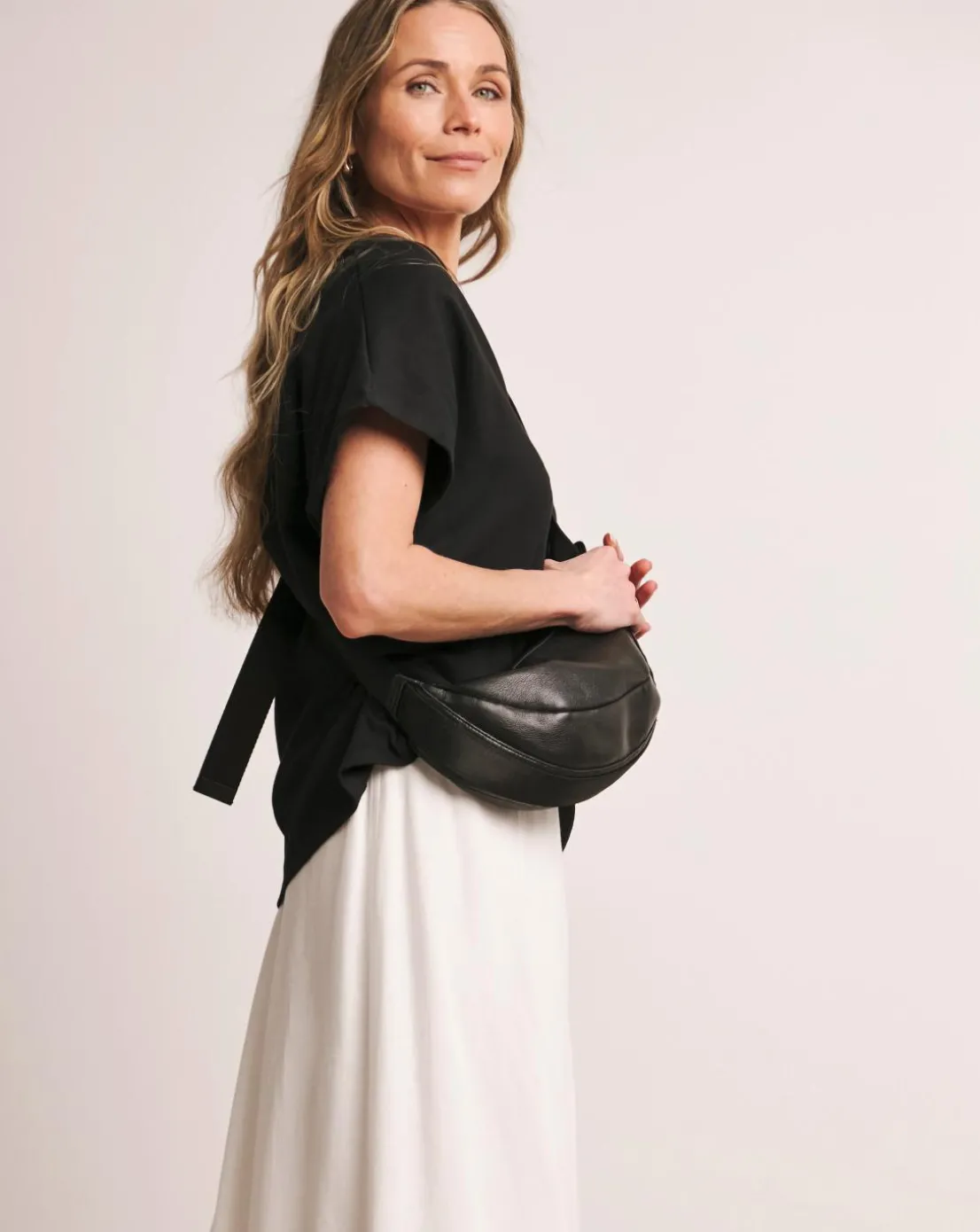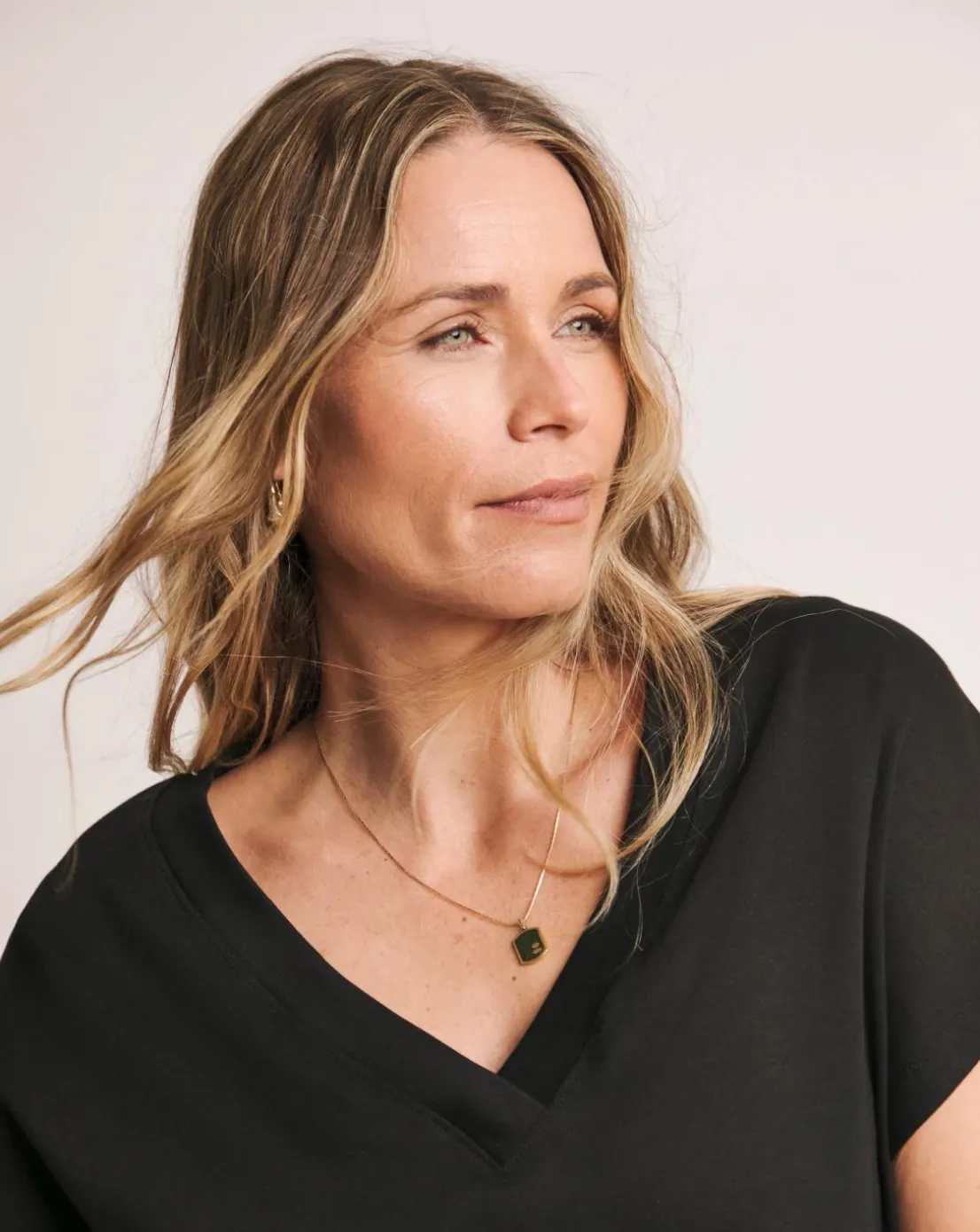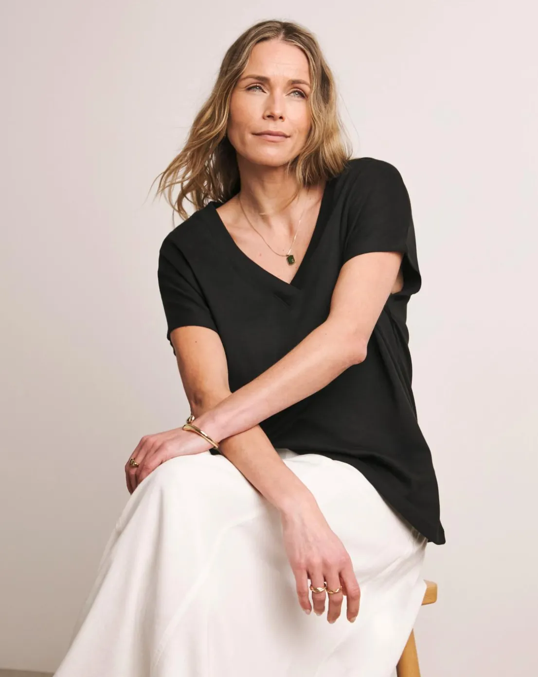 Our Anthology black t-shirt is a timeless staple. Featuring a v-neck and a relaxed fit, its’s the perfect piece for endless styling.