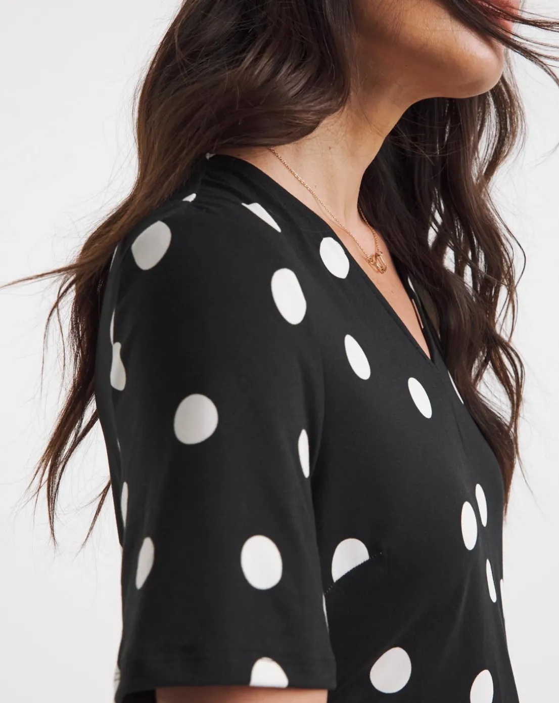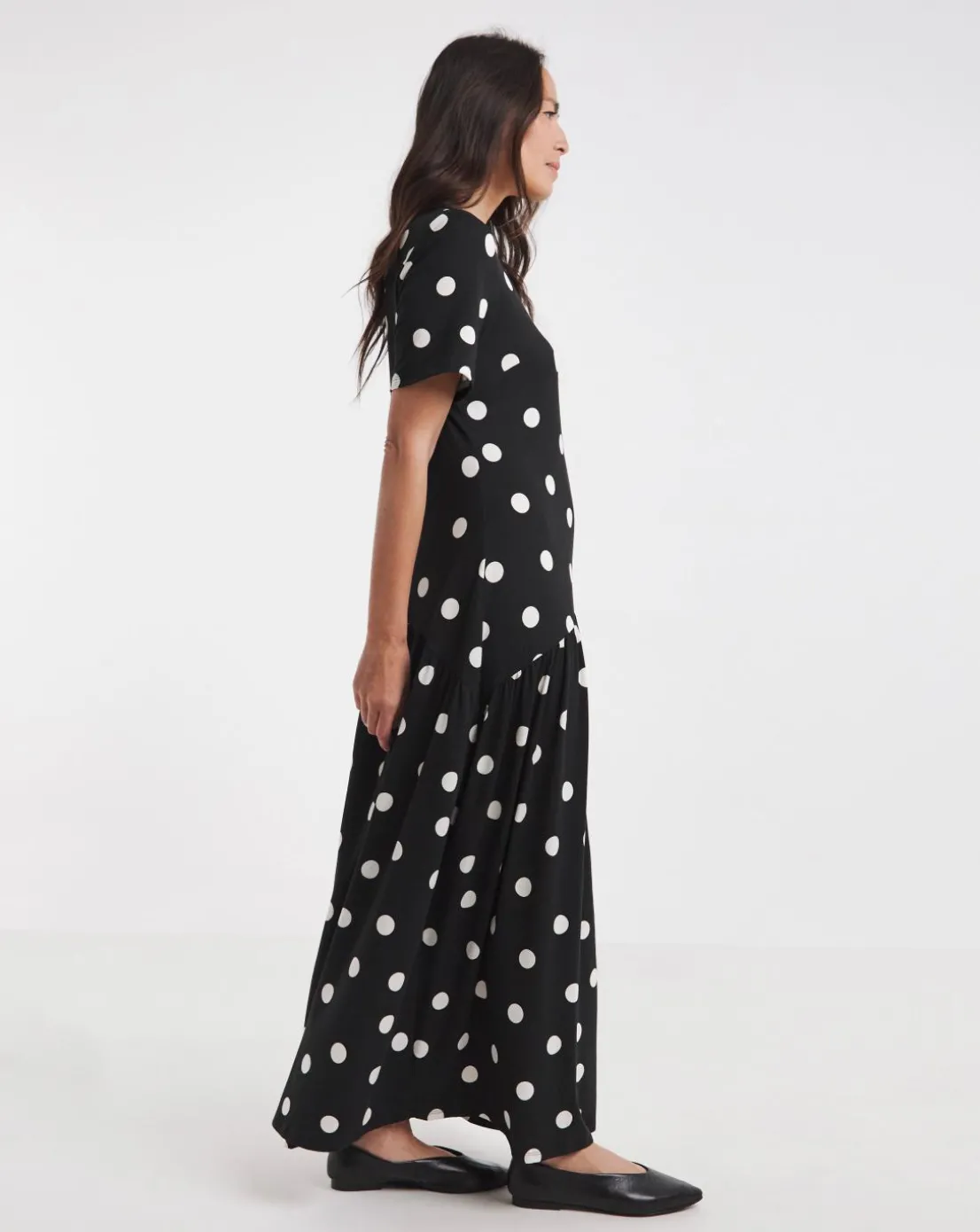 Our excellent value soft touch jersey asymmetric seam dress is back and has been redesigned in a simple spotted print. The dress features short sleeves, V-neckline, asymmetric seam along the swing and maxi length of 50 inches.