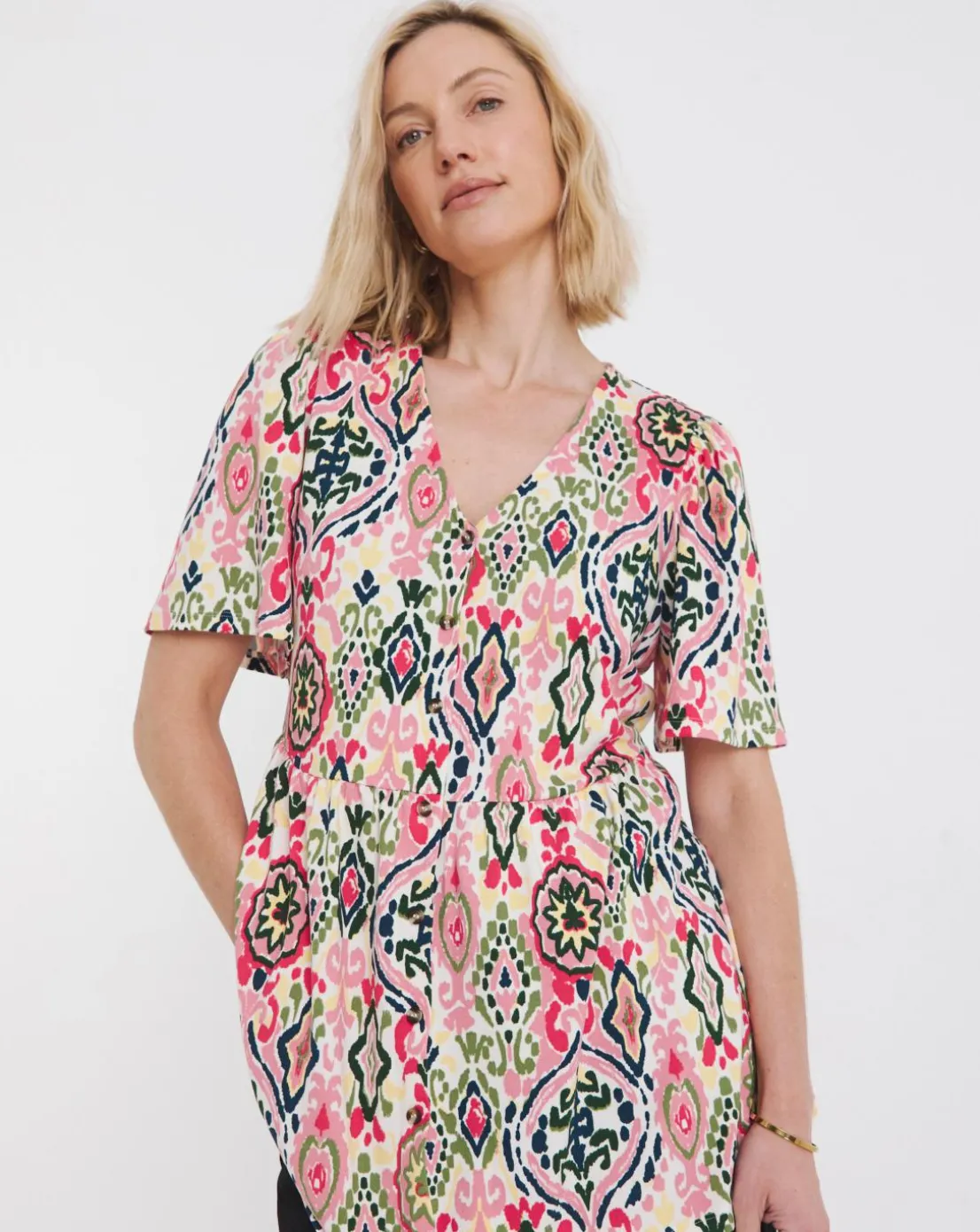 Our button front angel sleeve tops are a wardrobe essential. In a soft, stretchy jersey and longline shape, it’s a comfortable piece for every day. Pair this multi print with jeans or shorts for a casual, summer time look.