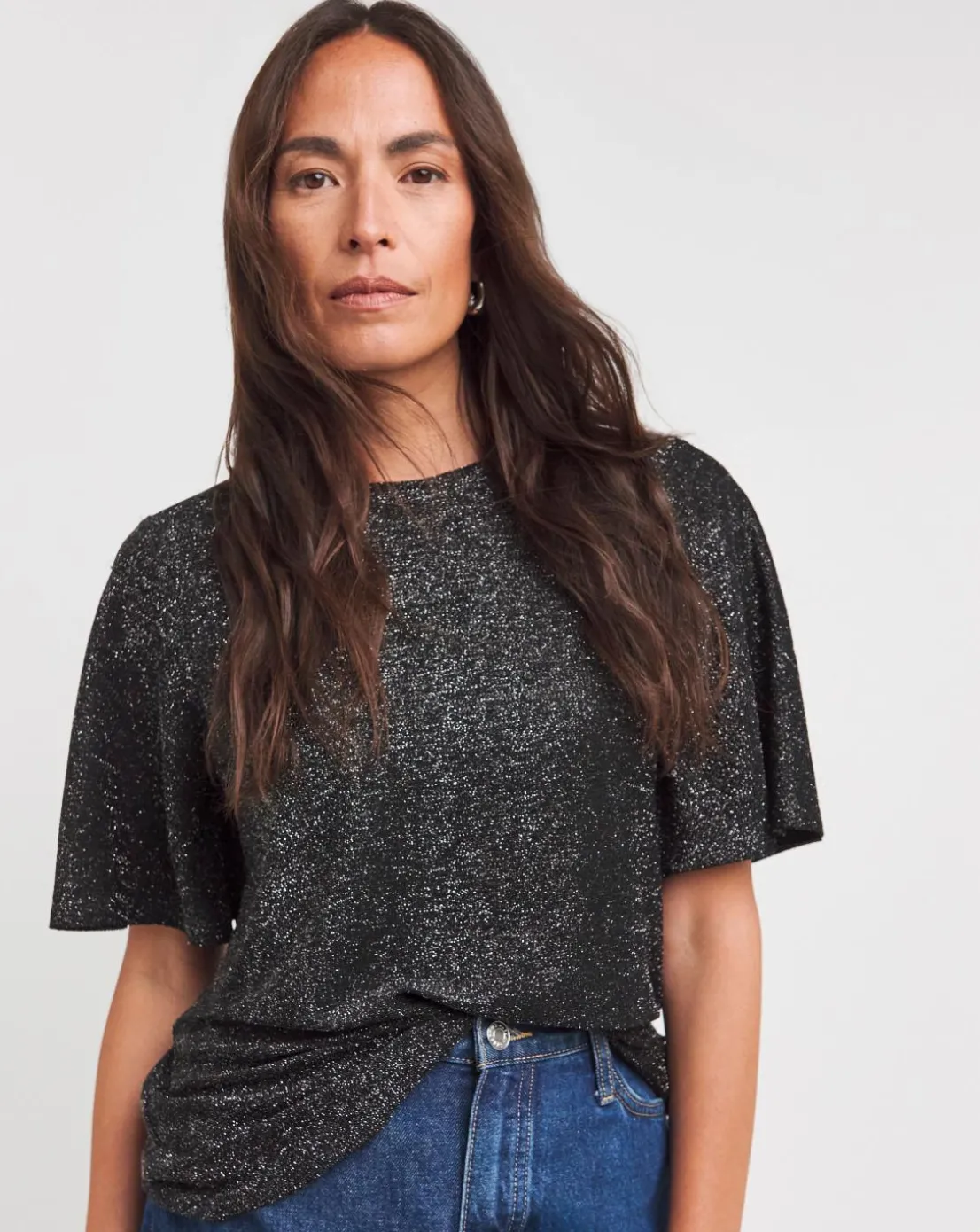 Our crew neck, angel sleeve, glitter knit top is a stunning addition to elevate your wardrobe. Pair with jeans and flats for an everyday look.