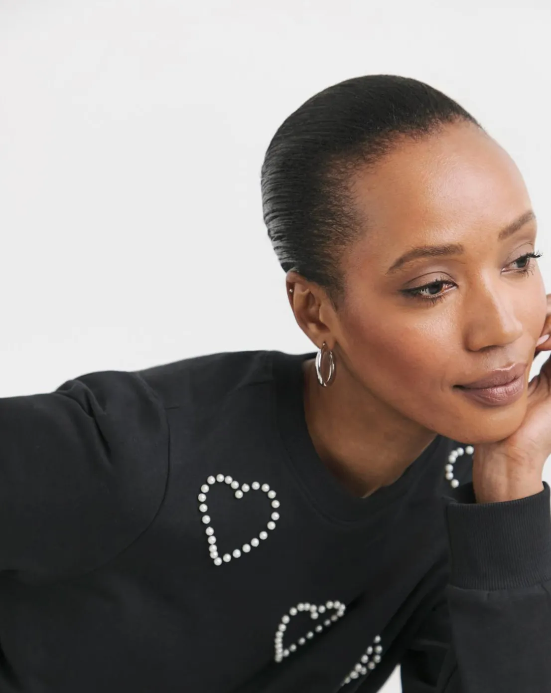 Our crew neck sweatshirt features peal heart details, pair with jeans and flats for an elevated everyday look.
