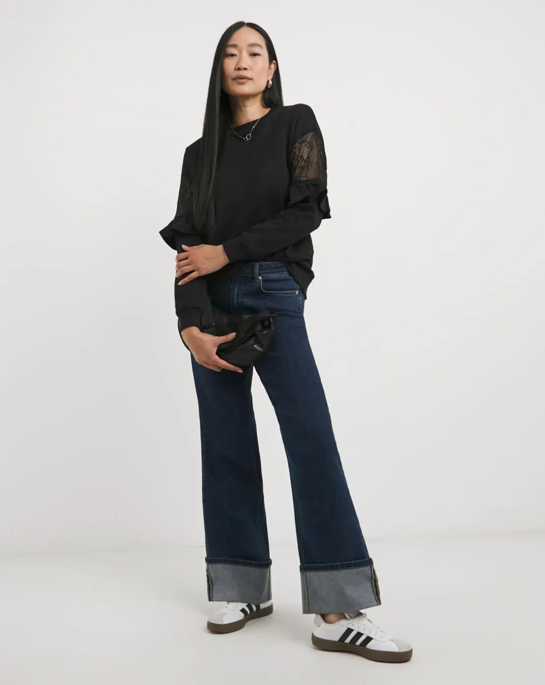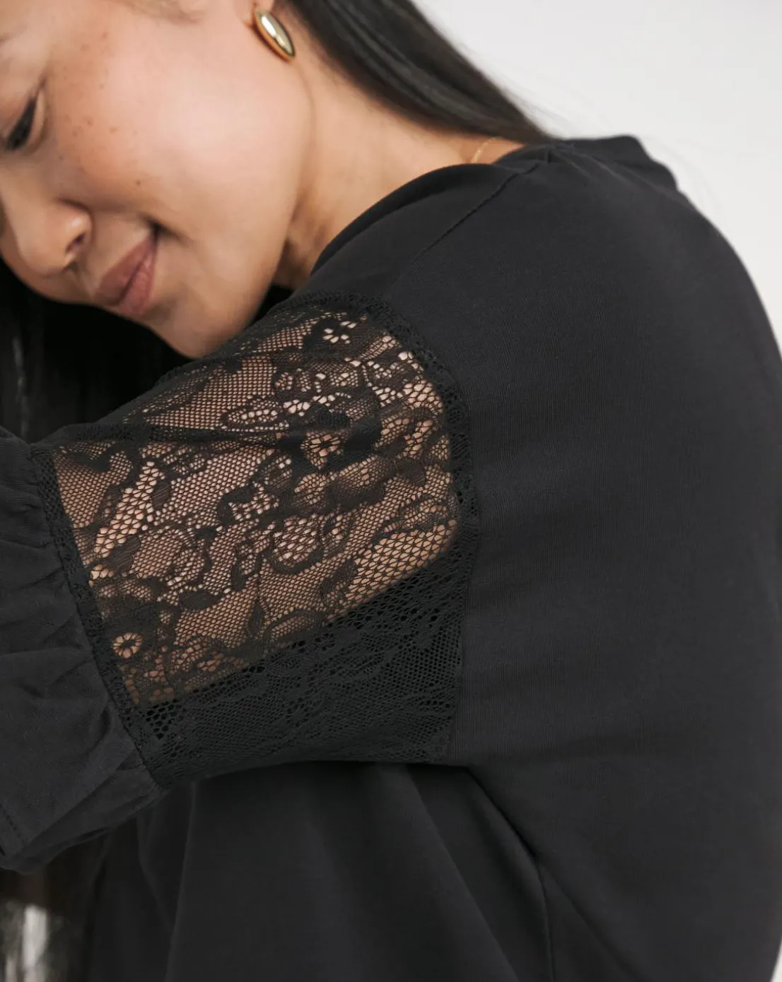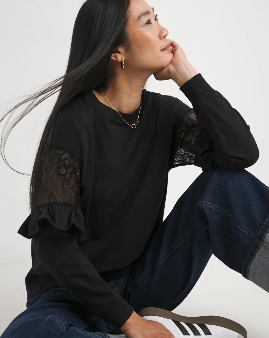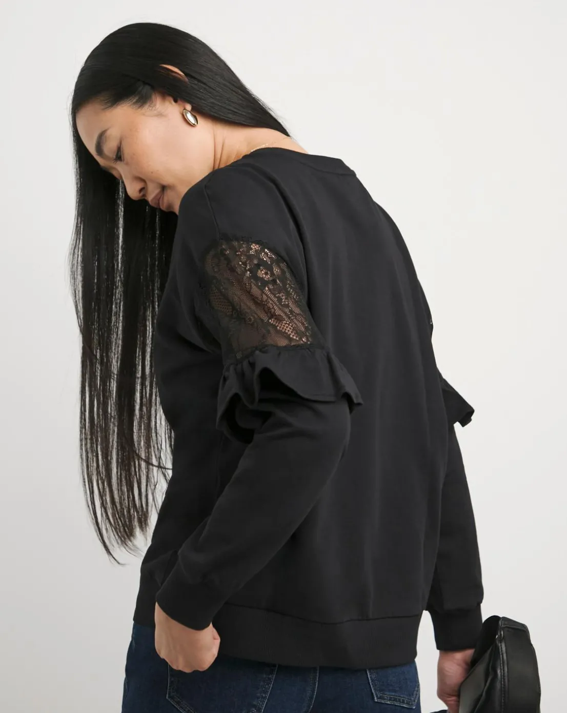Our black lace sleeve sweatshirt is a perfect addition to your wardrobe. It features lace panneling and frills with a relaxed fit.