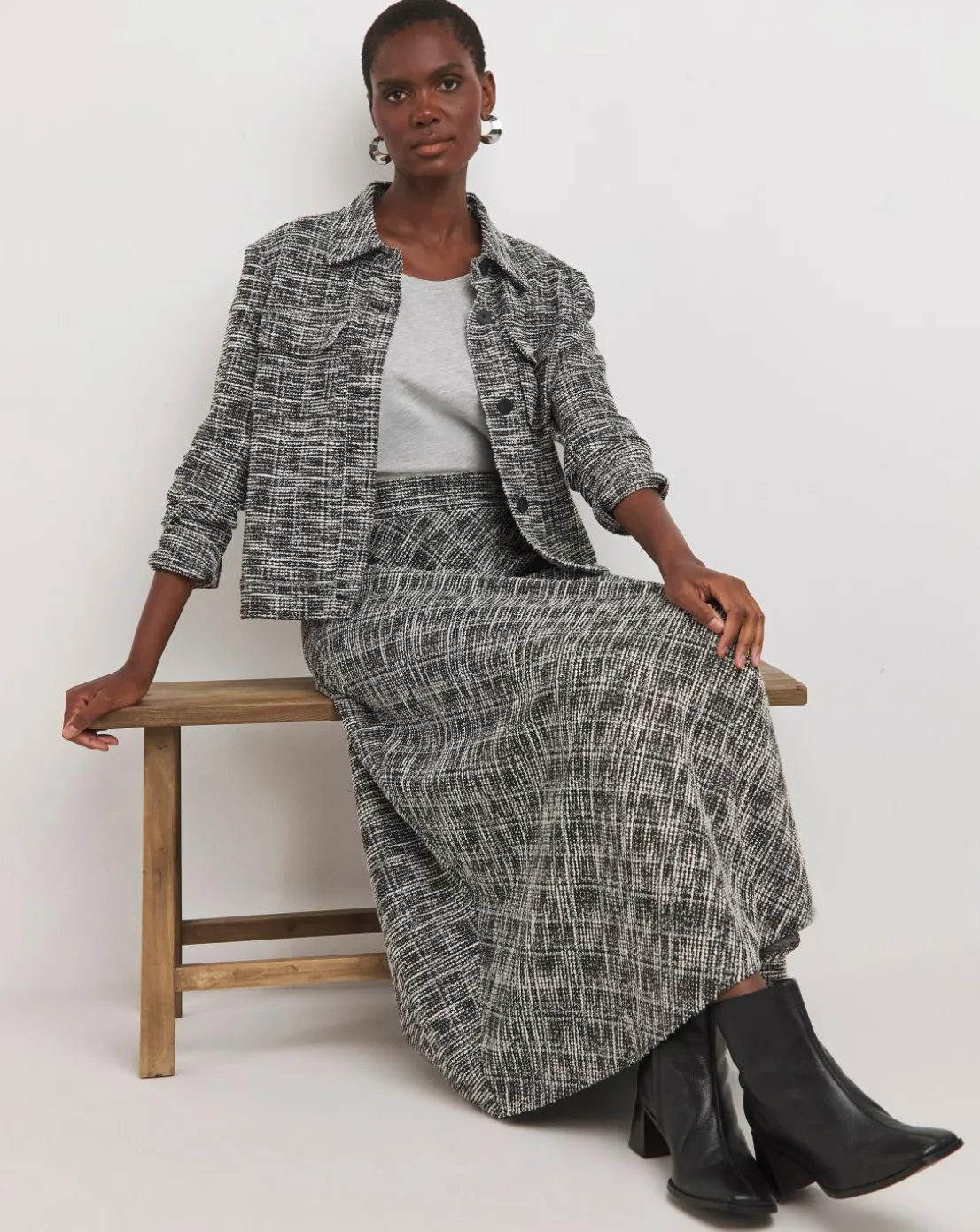 Our mono trucker jacket is the perfect layering piece. Made using a lightweight, comfortable boucle, it will elevate your every day outfits. Style with the matching maxi skirt or your favourite wide legs.