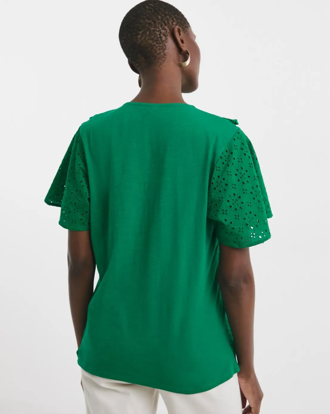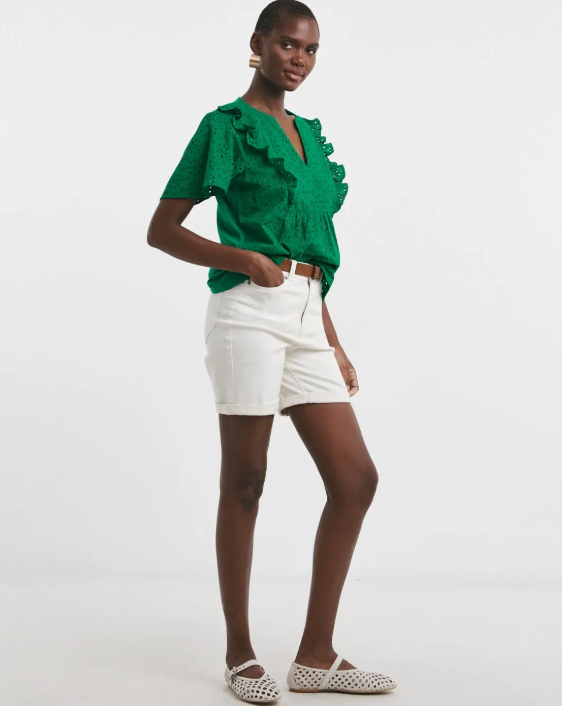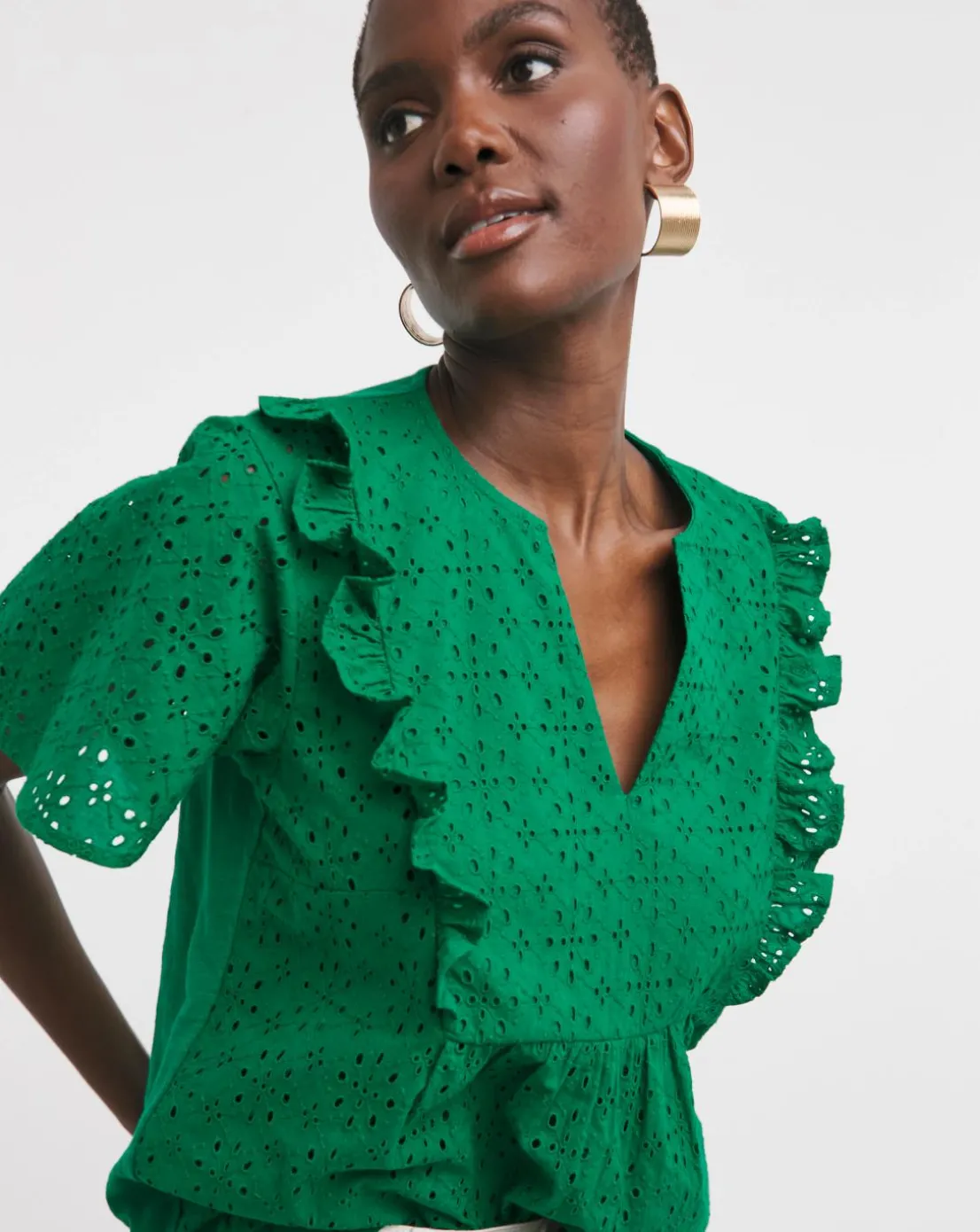 The perfect summer style! This top features a broderie design, a flattering V neck and frill details that will add interest to any outfit. Wear it with jeans, linen trousers or shorts, the ways to wear are endless.
