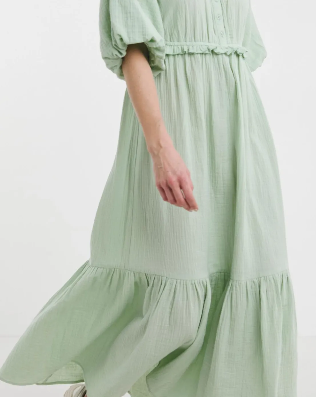 This bubble sleeve cheesecloth dress is the epitome of a summer dress, coming in a cheesecloth fabrication and two colourways mint and a stone print. The dress features a bubble sleeve with an elasticated waist, a tiered swing and a maxi length 50 inches.