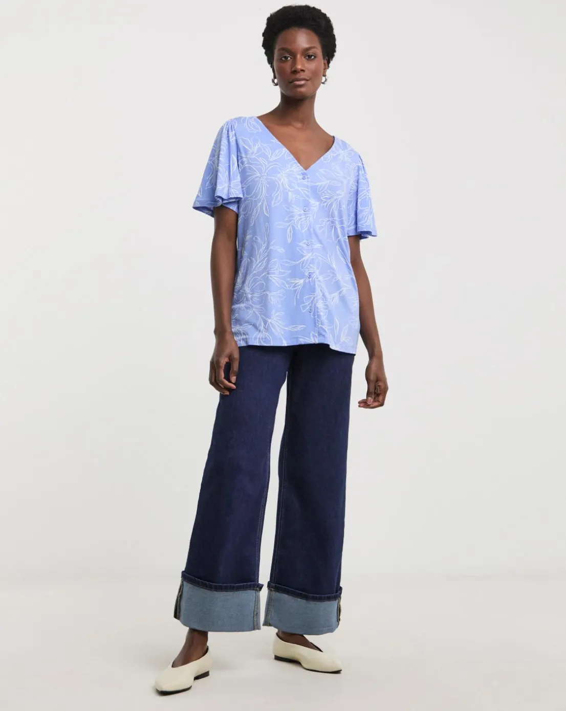 Our button front angel sleeve top is a must have in your wardrobe. Pair with jeans and flats for a stylish look.