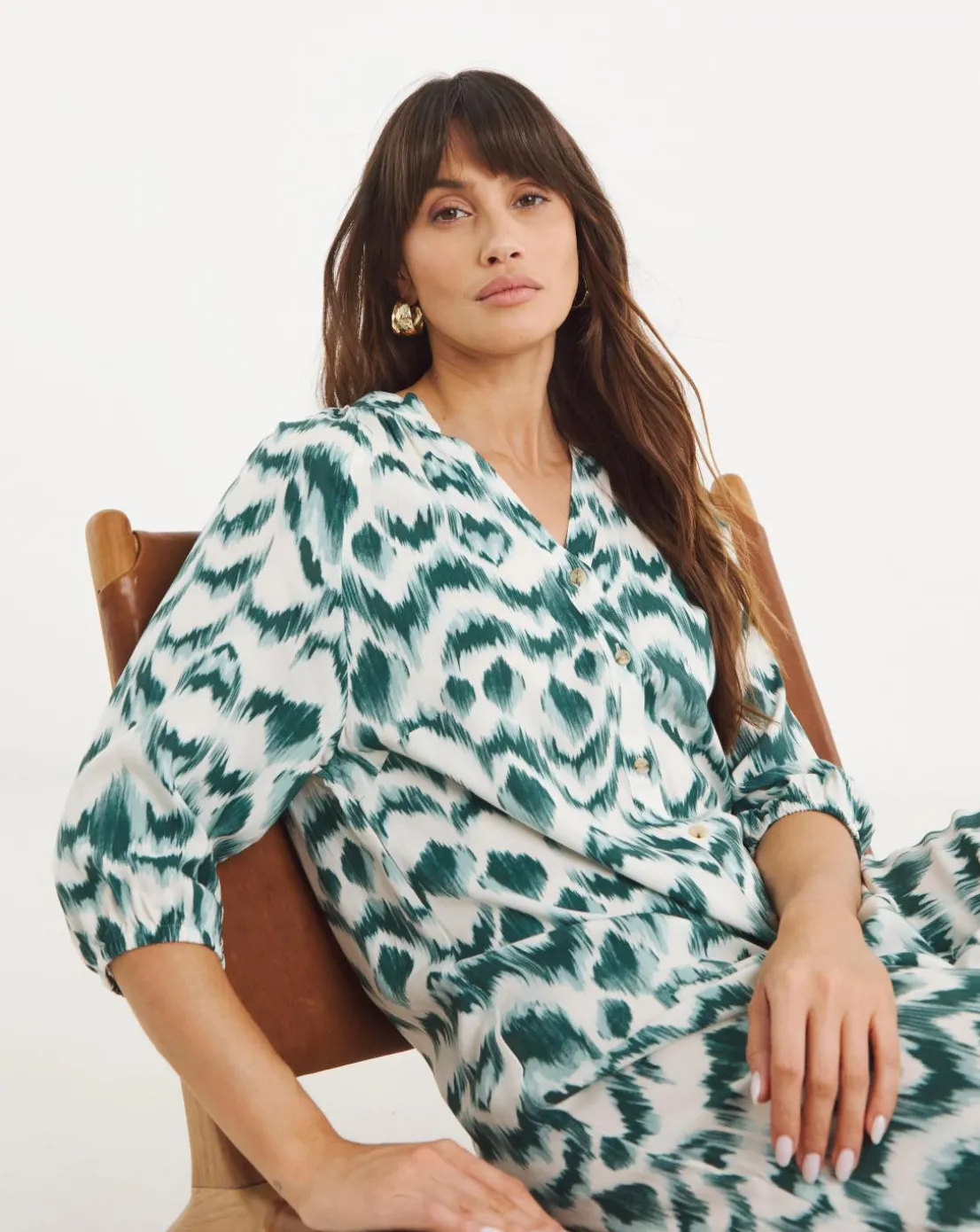 We have designed our bestselling kaftan in a gorgeous new khaki print to give you a hint of European culture at your sleeve. The dress features half sleeves, a V-shaped neckline and a button through front. The length falls to 48 inches.