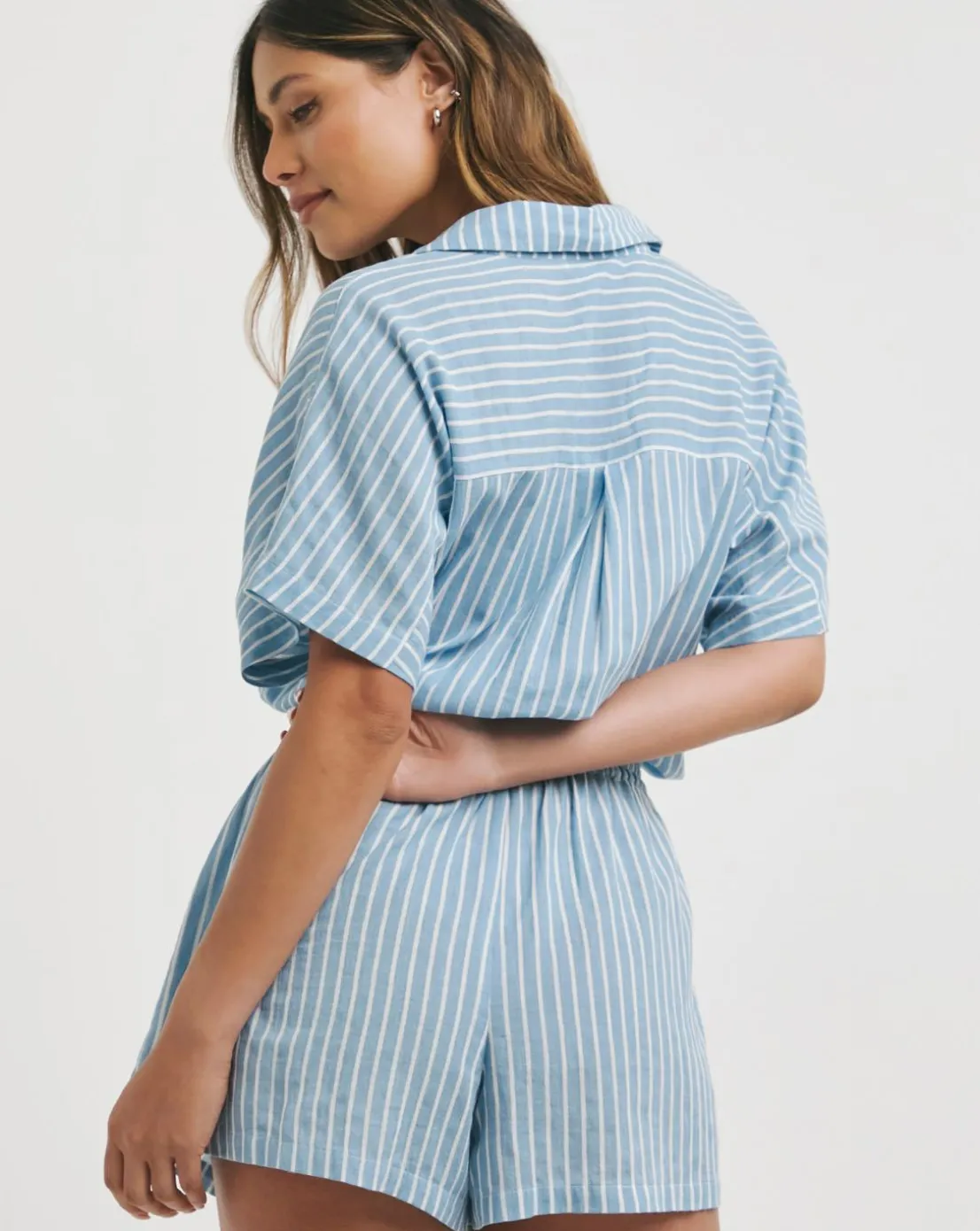 Framed with a flattering v-neck and short sleeves, this playsuit has a loose-flowing shape and offers light, airy wear thanks to its cheese cloth composition.