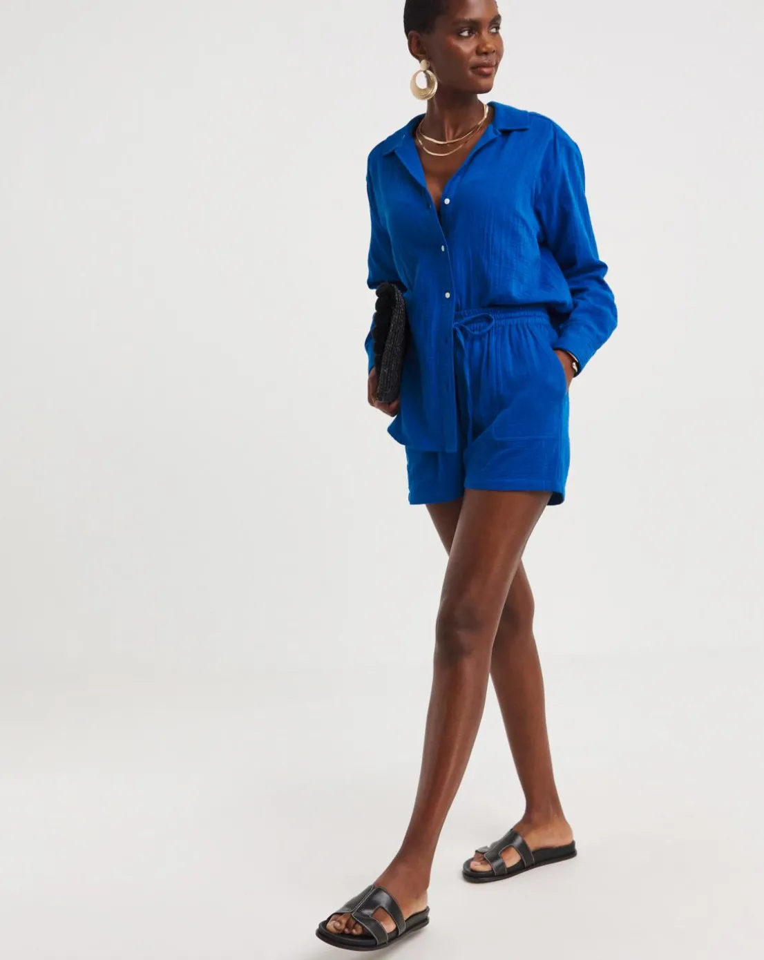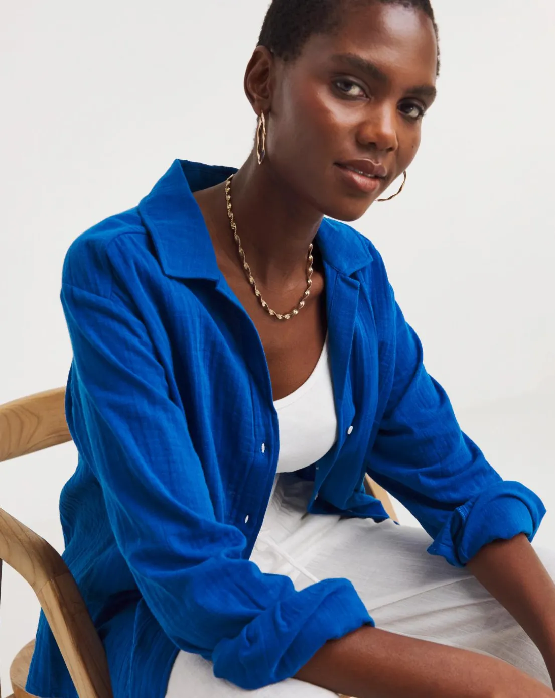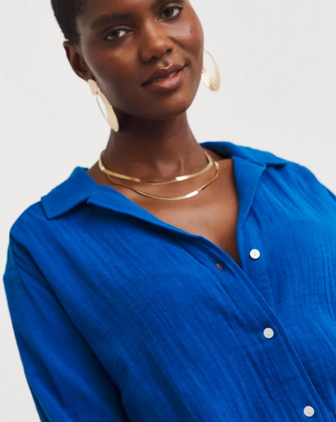 This blue cheesecloth shirt is the perfect way to add a pop of colour to your wardrobe this season. Featuring an oversized fit, it’ll look great with denim, and you can also style it open with a cami underneath.