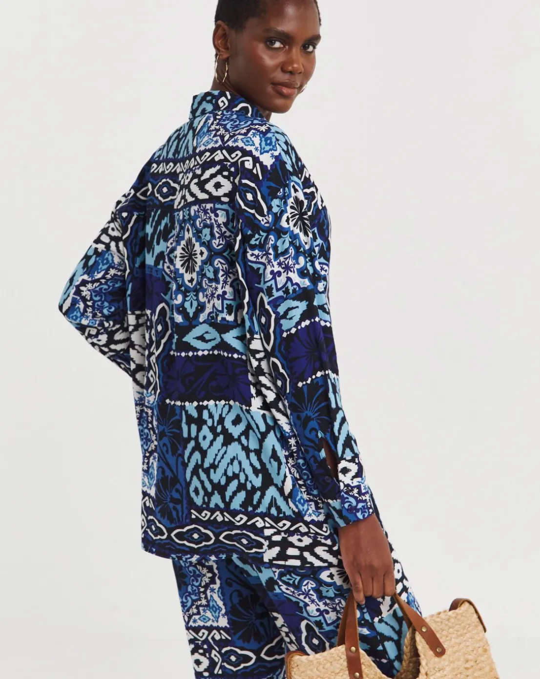 Look holiday ready with our scarf print shirt. The colours and print are super fun for the season, and will look great styled with a pair of black denim shorts and sandals. Also available as a co-ord with matching trousers.