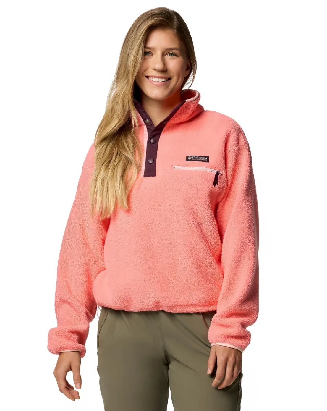 Elevate your wardrobe with this Columbia Helvetica II Cropped Fleece. A classic for utility and style. Crafted of plush textured fleece to ward off chill, this snap-front pullover features handy details for any adventure.
