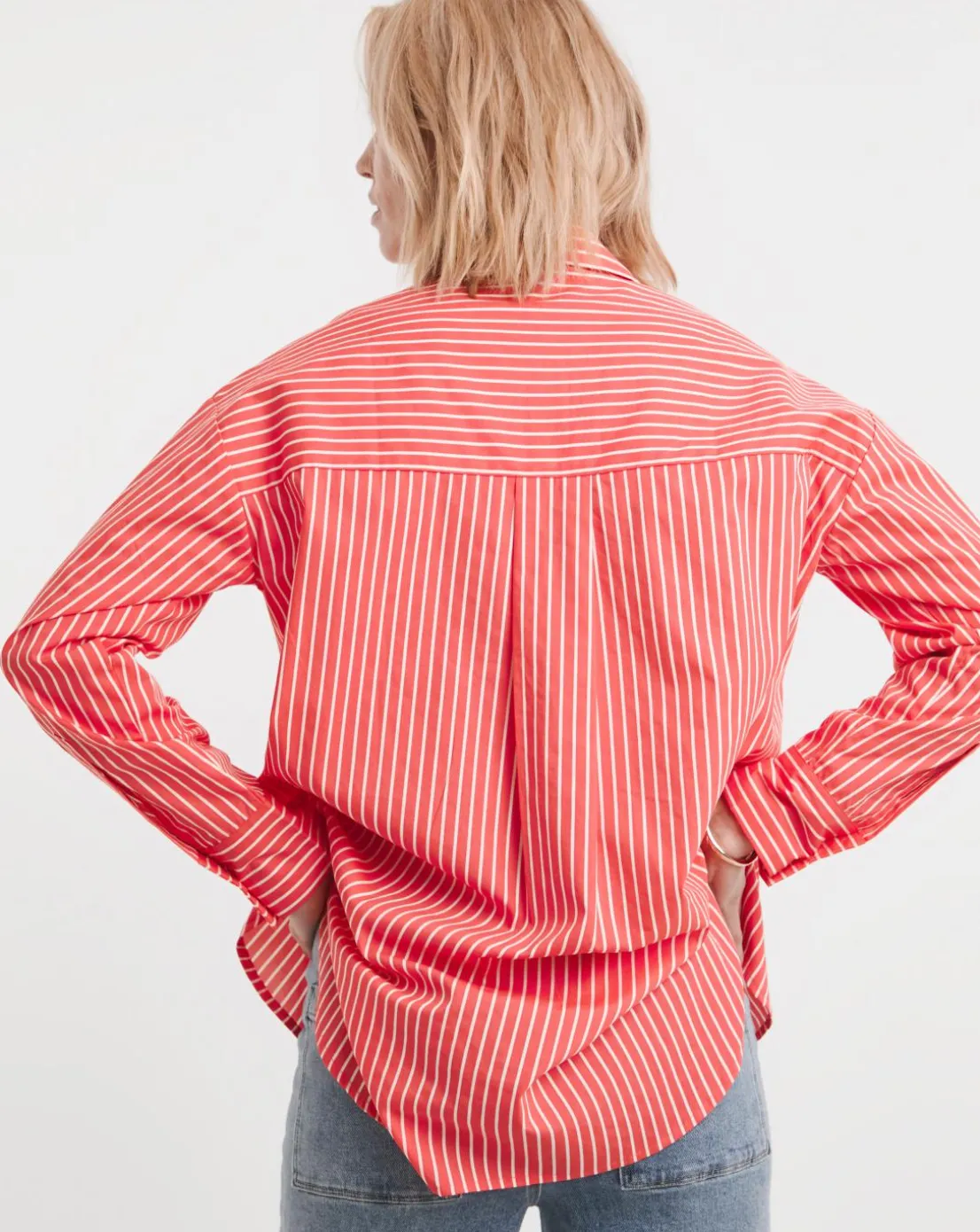 This oversized pink stripe shirt is a modern update on a timeless and classic wardrobe staple. Perfect for desk to dinner and everything in between. It’ll look great styled with denim and ballet flats, or worn over wide leg trousers with some chunky loafers.