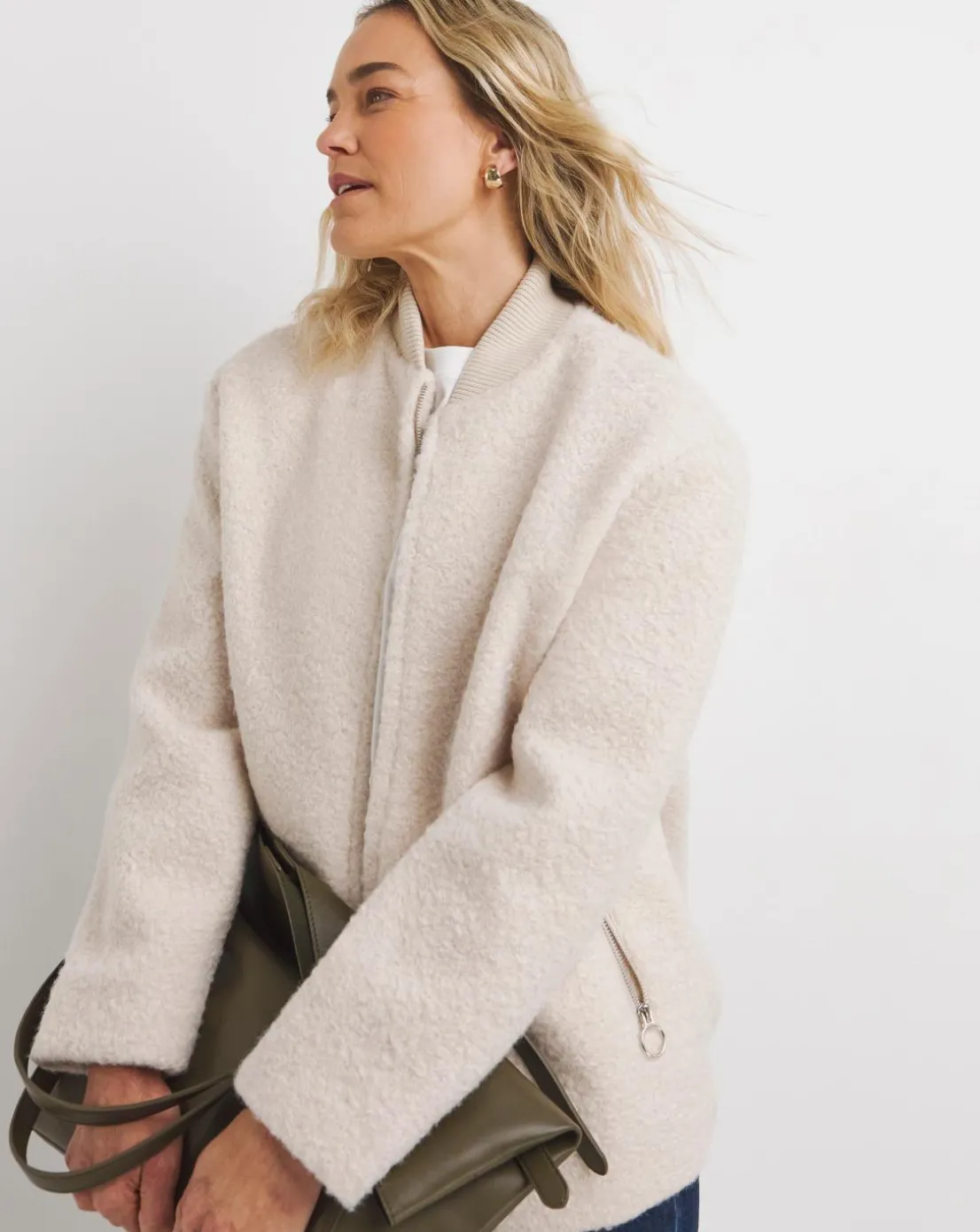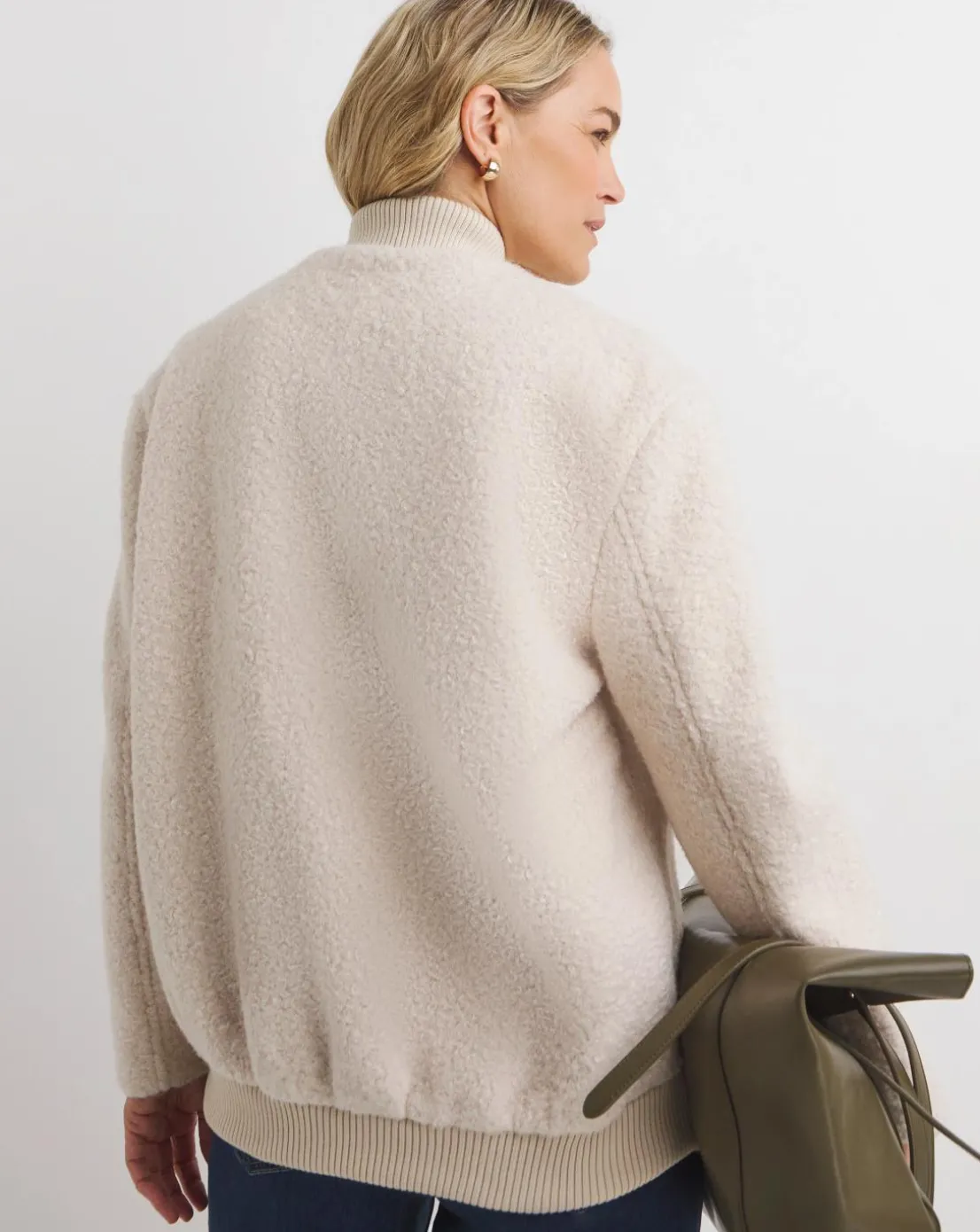 Feel stylish and cosy in this cream wool like bomber. Featuring a ribbed collar, zip fastening and zip pockets. Dress up or down.