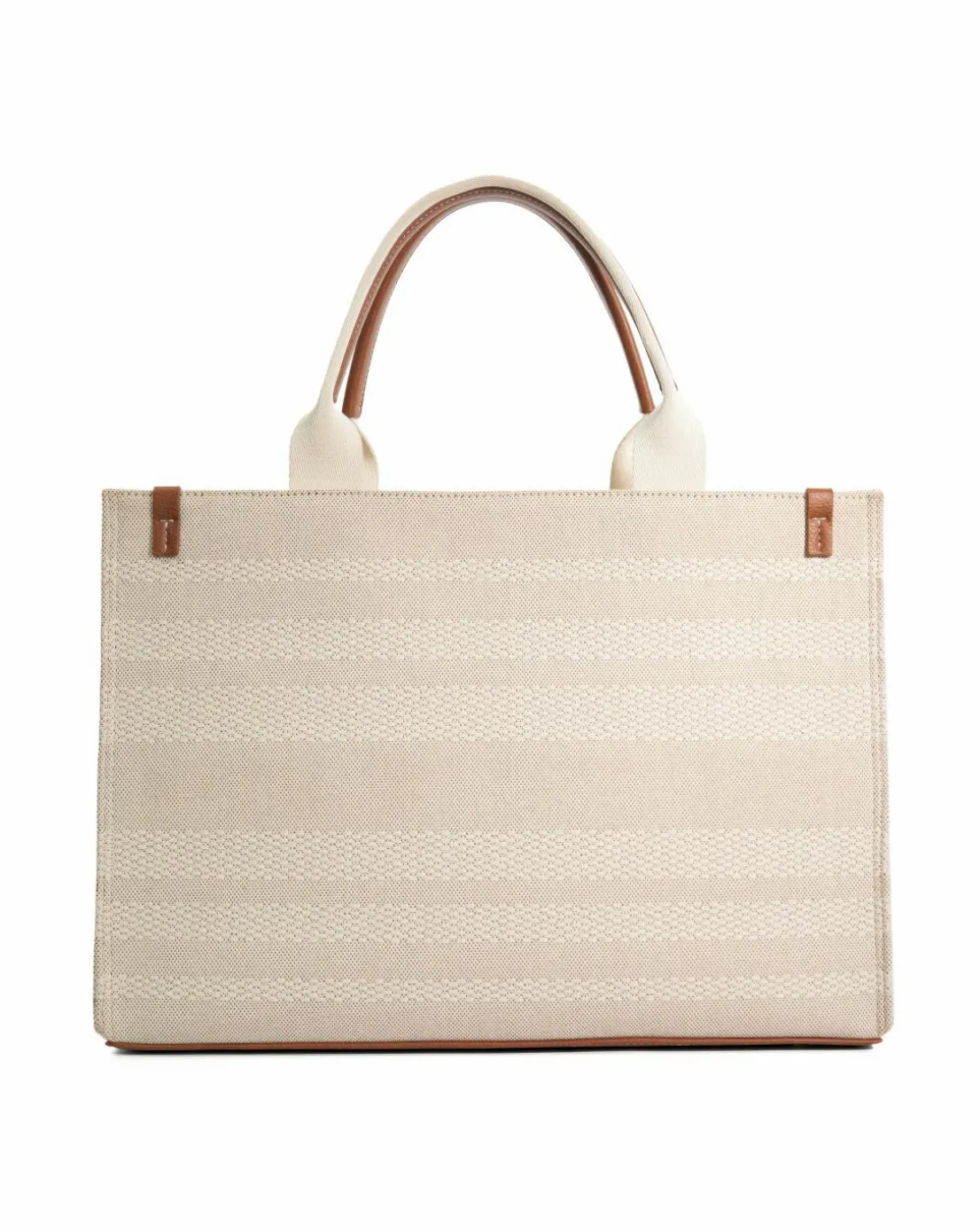 A tote bag is an iconic staple style. Elevate your warm-weather ensembles with Deltra. Featuring a trimmed top handles and a removable strap for ease of wear this signature silhouette boasts a stripy motif and a detachable coin purse for organised storage and our bespoke embossing that’s certain to take your holiday edit to the next level. Finished with a secure magnetic closure Deltra will become the focal point of your warm-weather ensembles.