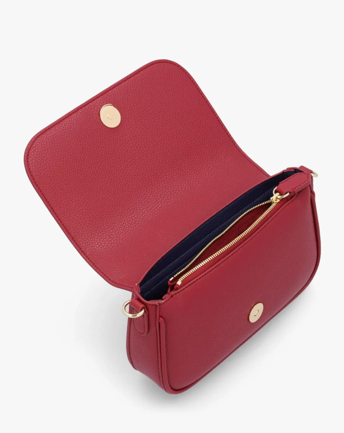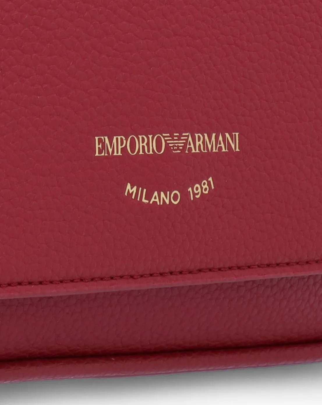 - The Emporio Armani Burgundy Cross-Body Bag is a classic style that will see you through Season after Season. Crafted from a premium pebbled PU material with polished gold tone hardware. The secure magnetic snap front flap allows access to the main compartment featuring handy inner zip and card slot pockets. Carry by the detachable webbed logo strap on the shoulder or across the body. Signature Emporio Armani branding completes the design.