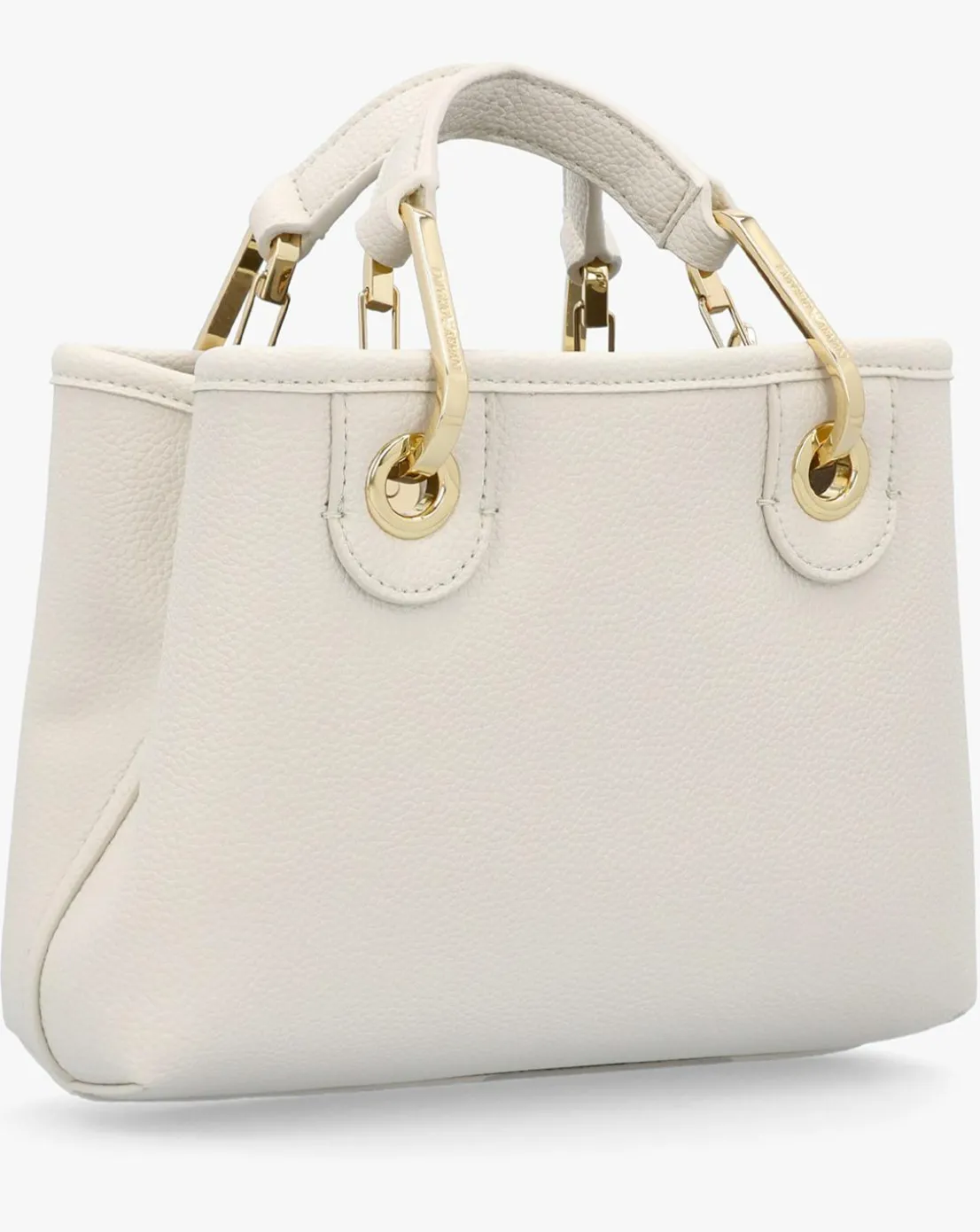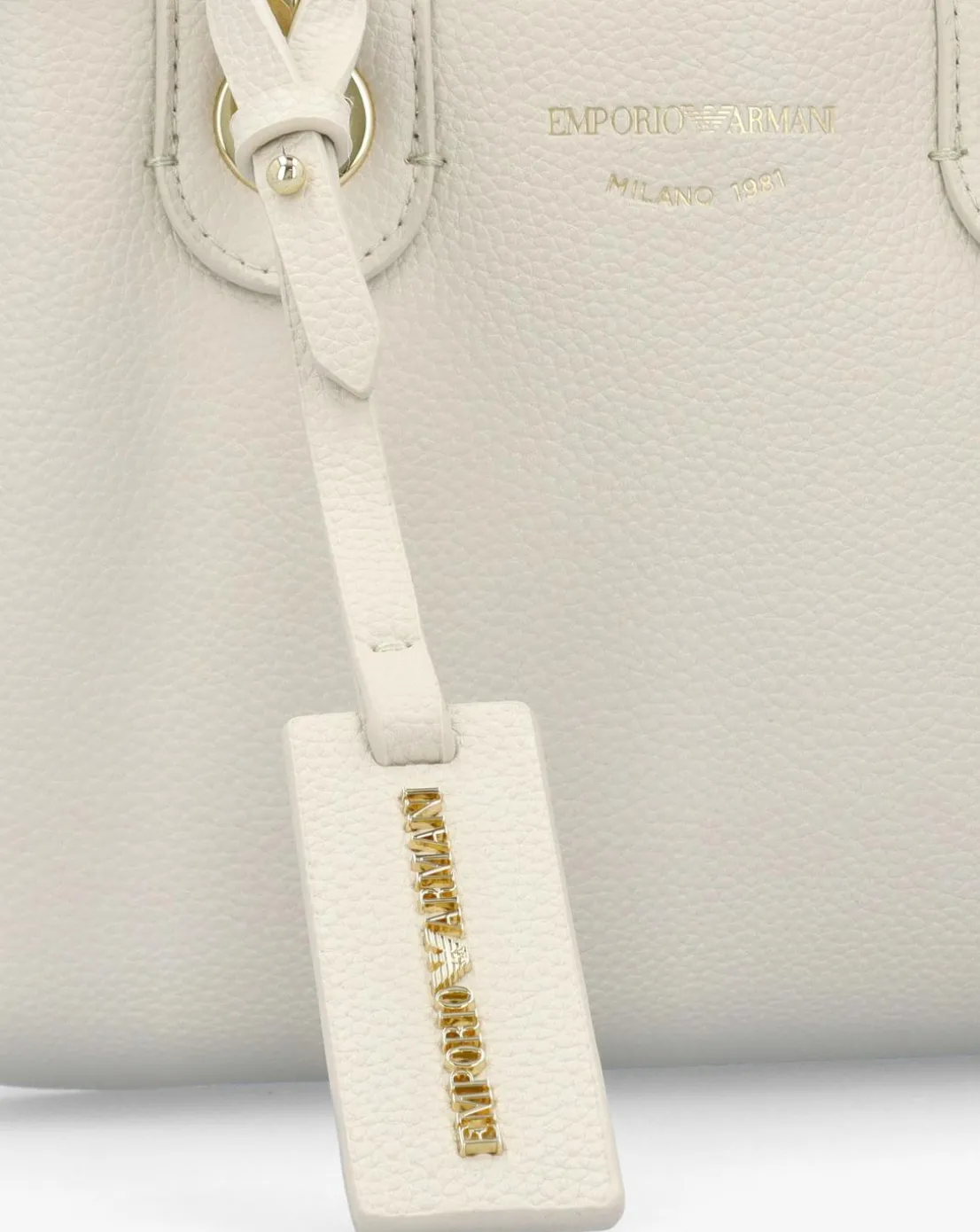 - This Emporio Armani X Small Cream Cross-Body Shopper Bag is the perfect day bag style. Crafted from a premium thermoplastic polyurethane in a deer-print finish with polished gold tone accents. The secure magnetic snap fastener allows access to the main compartment with handy inner slot pocket. Carry by the top handles or go hands free with the detachable logo webbed strap. Classic logo luggage tag adds detail. Signature Emporio Armani branding completes the design.