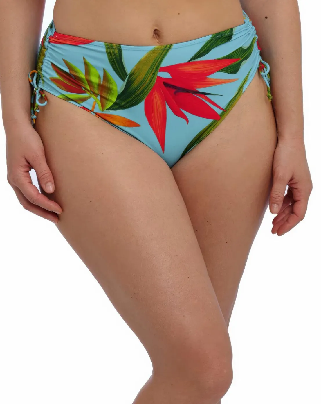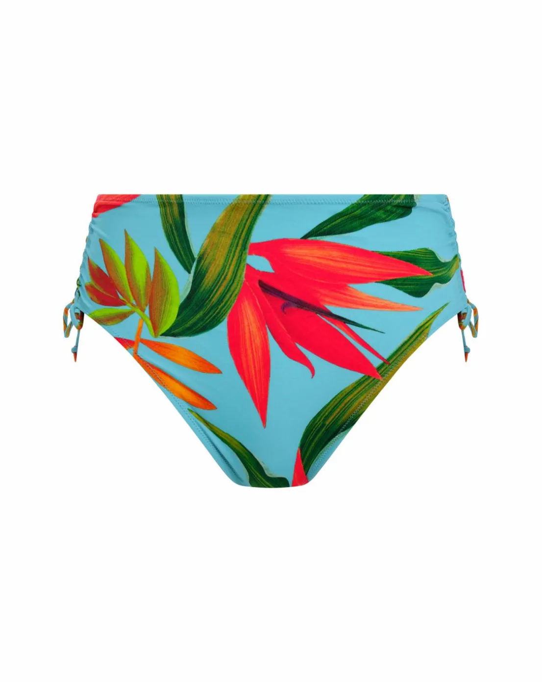 Transport yourself to tropical shores with Pichola. Ocean inspired summer aqua creates the perfect ground for the pops of seasonal reds, oranges and shades of green that make up this collection. The Bikini Brief offers a flattering high rise coverage. Adjustable sides for variation of leg coverage. Fully lined.