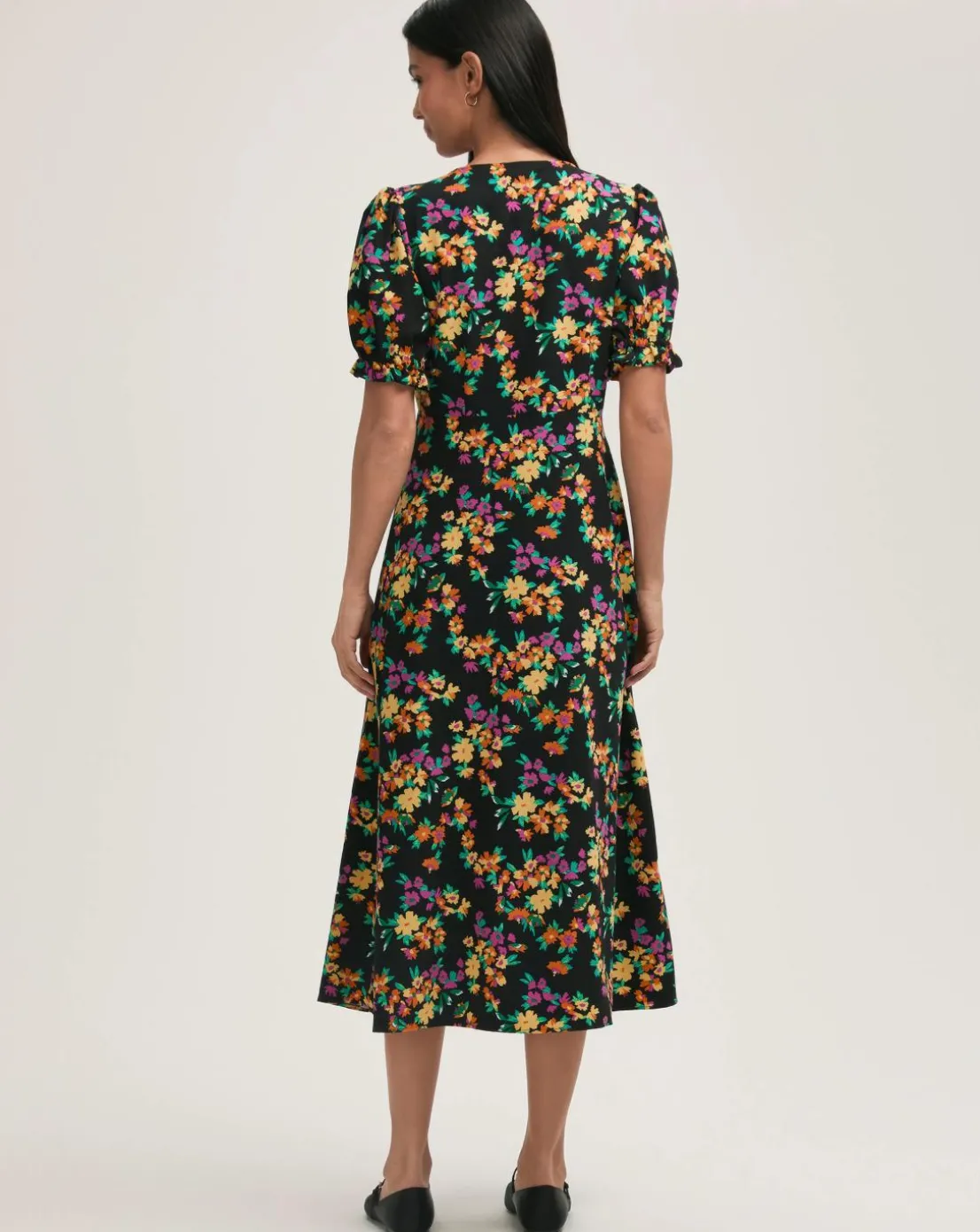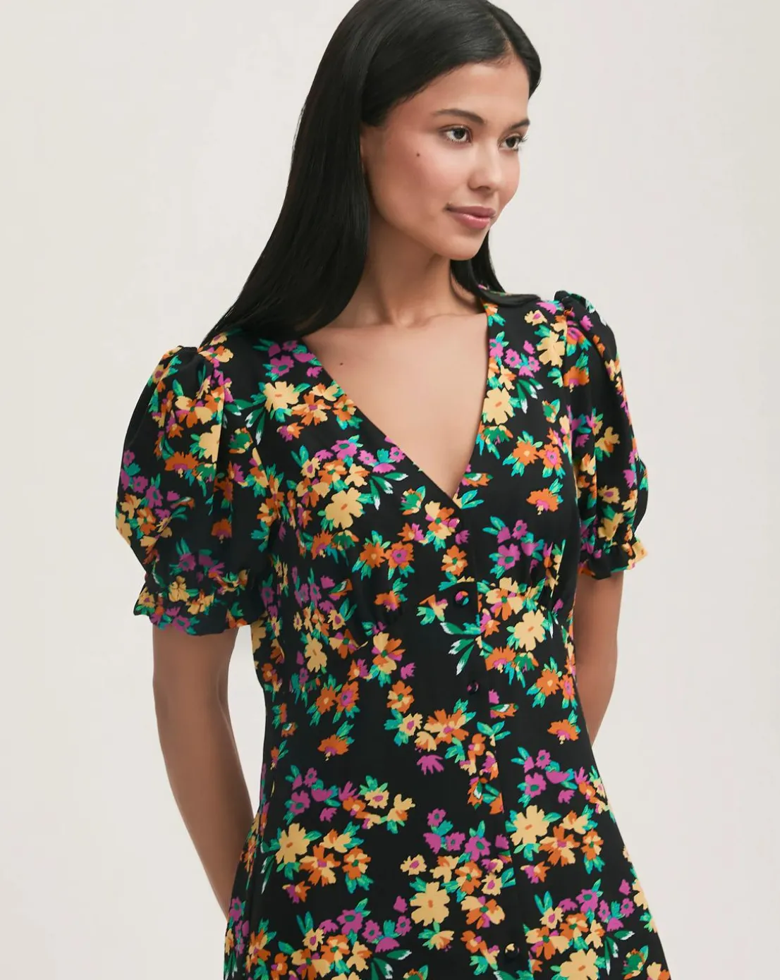 A classic button-through midi dress, Alia is crafted from our crease free crepe and features a feminine v-neckline and short puff sleeves with frill detailing.