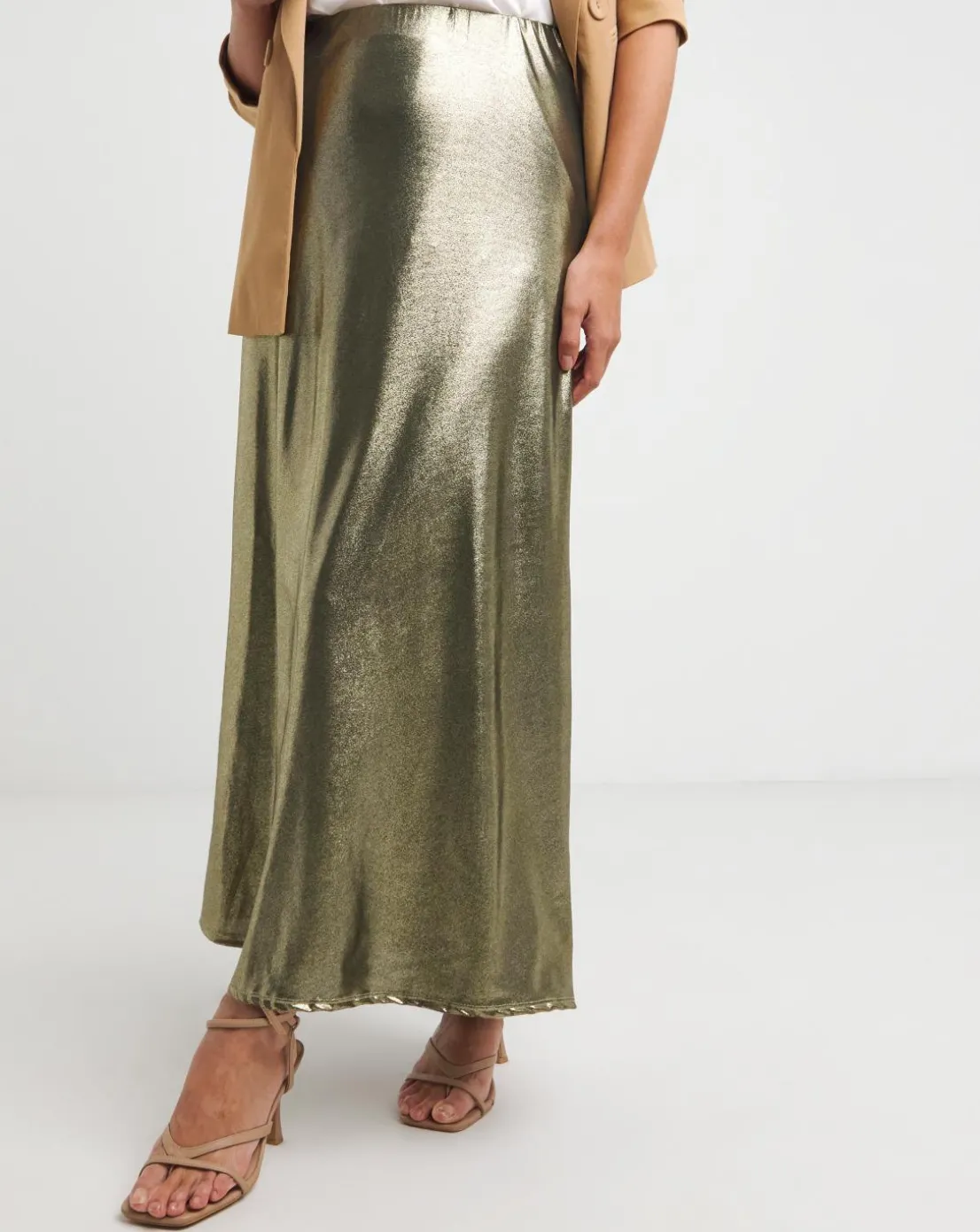 This skirt is crafted from a slinky stretch jersey fabric with a metallic finish. Cut to a flattering bias slip shape in an easy pull on style, this is a versatile desk to dinner wardrobe staple.