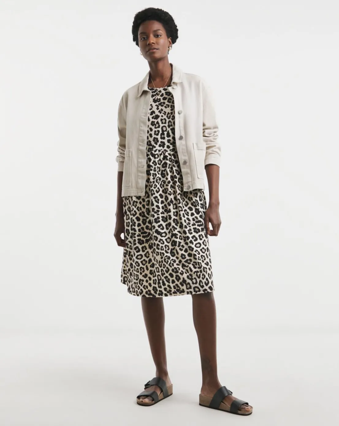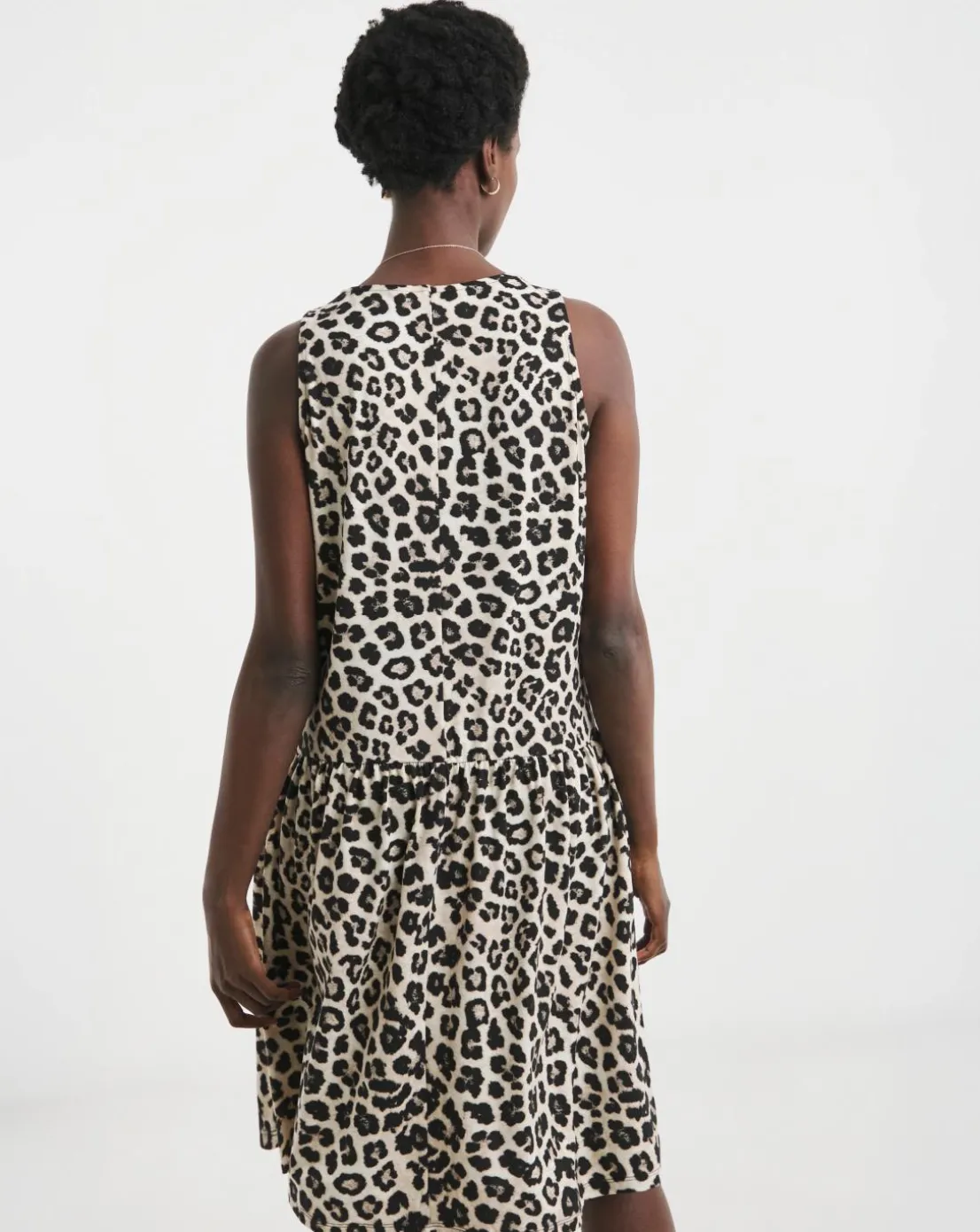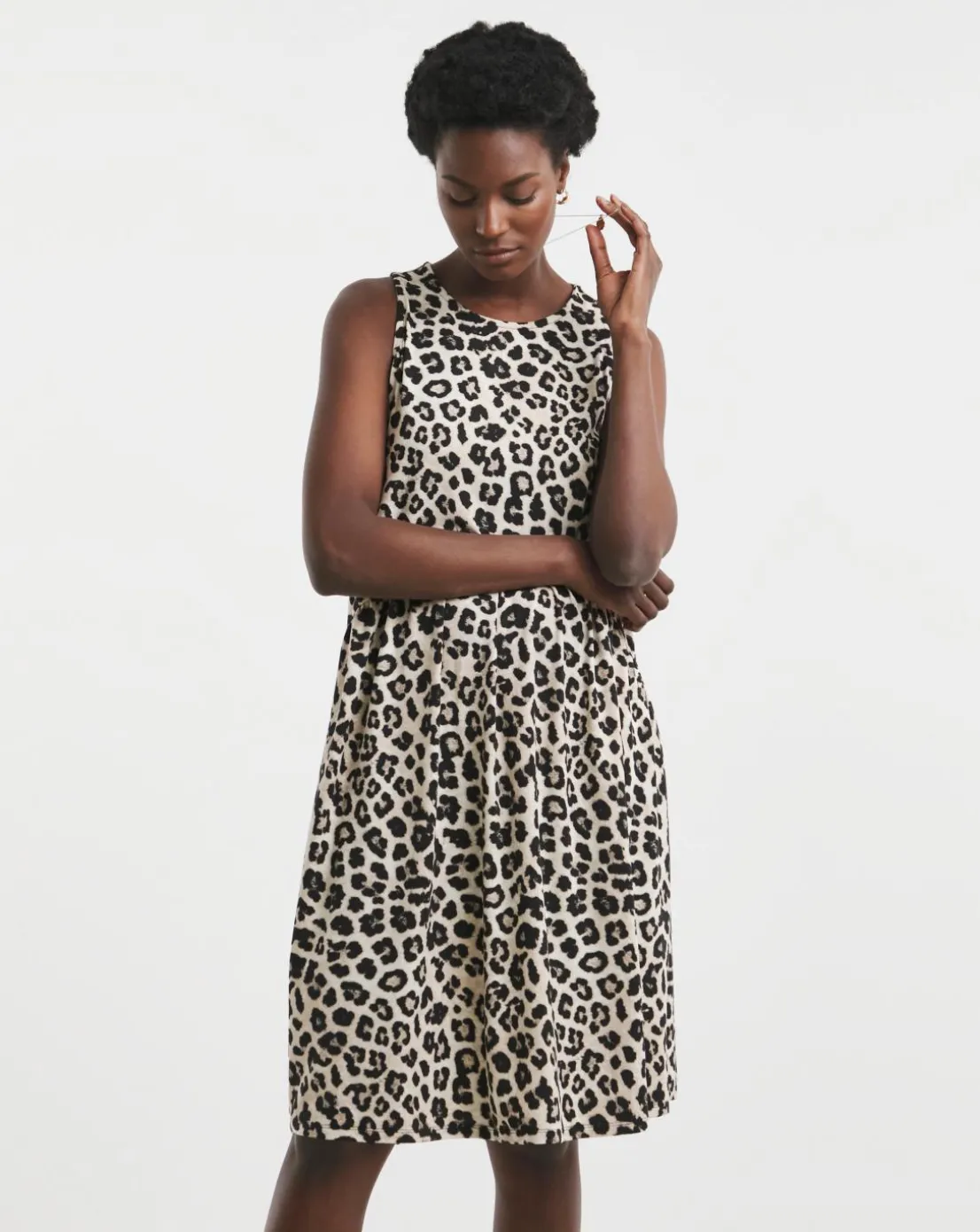 Our great value soft touch sleeveless smock dress comes in two colourways, a leopard print and a solid black. The dress features a knee length 37 inches and sleeveless arms, an empire seam and a relaxed fit.