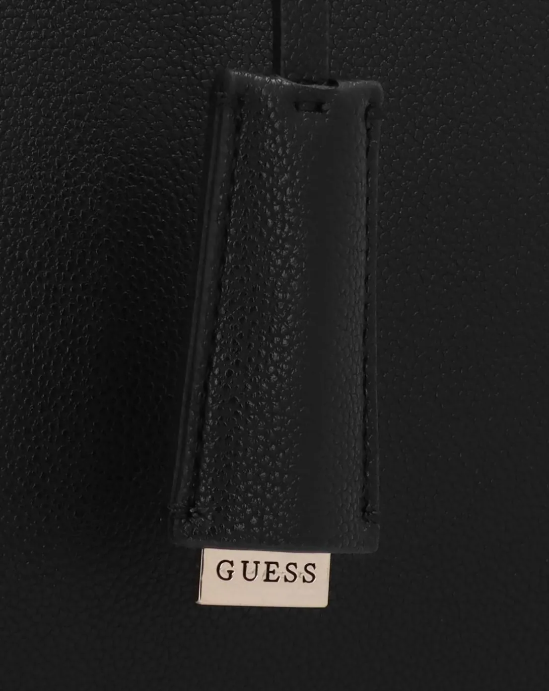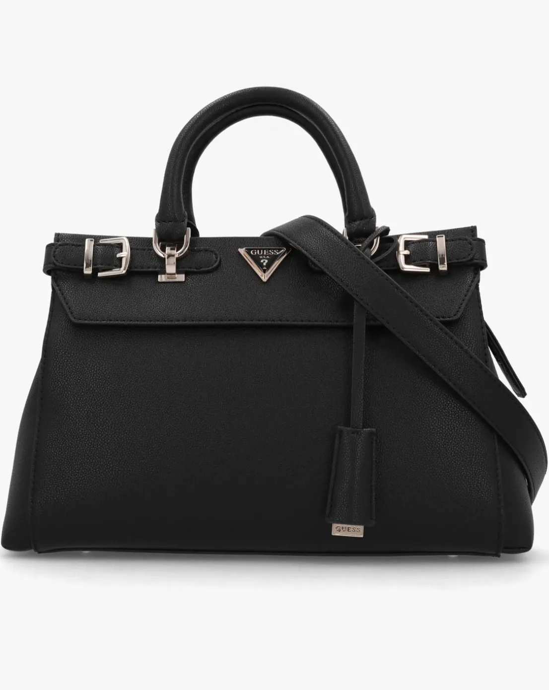 - The Guess Ali Luxury Black Satchel Bag is part of the New Season collection. This classic carryall style will see you through Season after Season. Crafted from a premium pebbled PU material with polished gold tone hardware. The secure top zip fastener allows access to a triple logo lined compartments as well as handy inner zip and slot pockets and exterior zip pocket. Carry by the grab handles or the detachable PU strap. Classic triangular GUESS logo motif and buckles add detail as well as logo luggage tag. Signature GUESS branding completes the design.