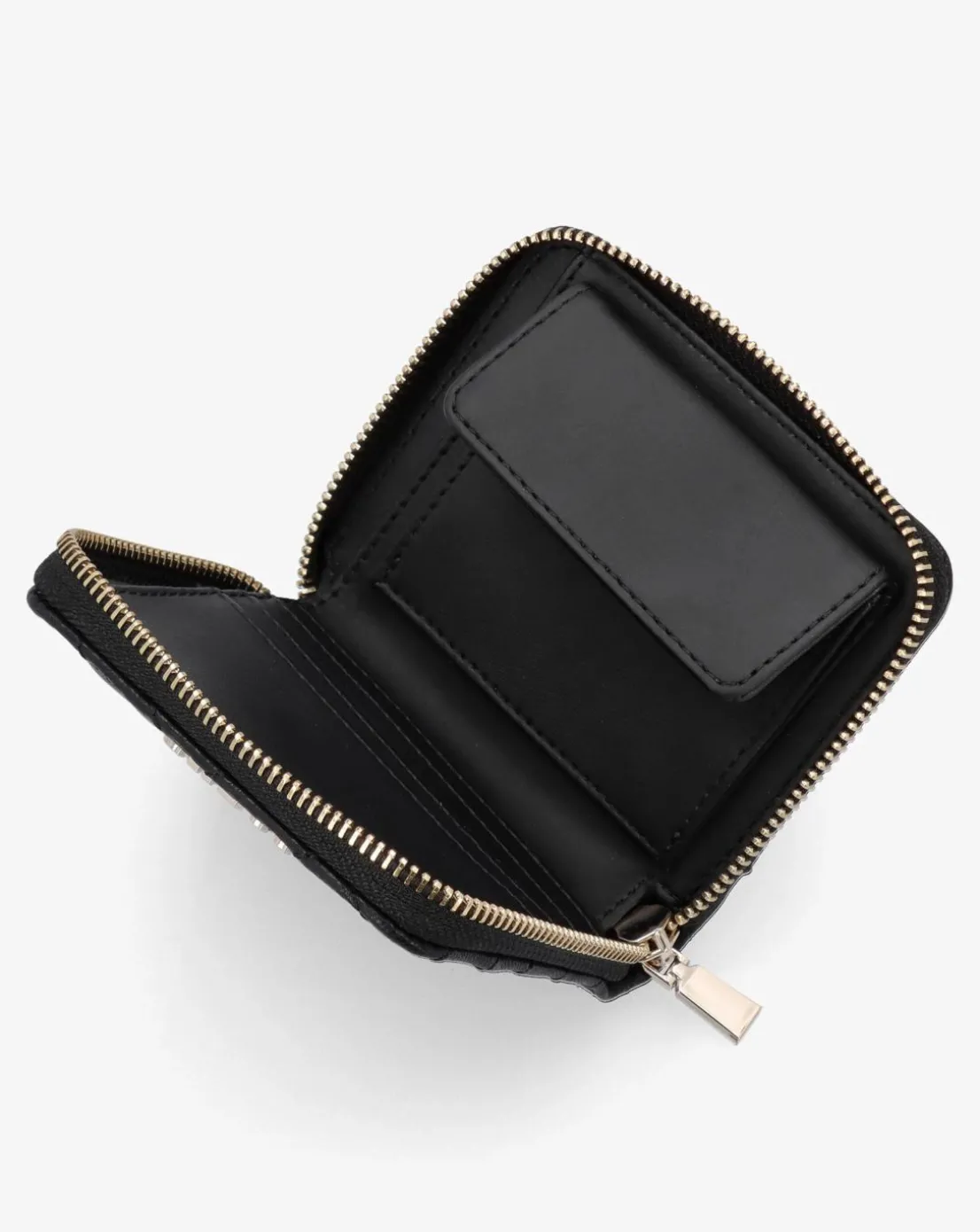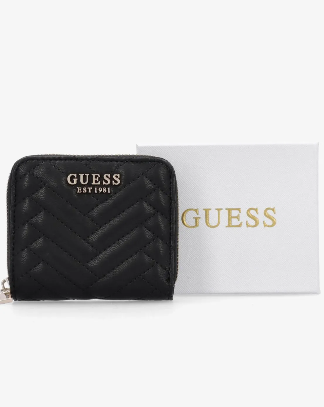 - New from GUESS this Season is the Guess Anning Quilted Black Zip Around Wallet. Crafted from a premium PU material in a classic chevron quilted design with polished gold tone accents. The secure zip around fastener allows access to card slots, coin pocket and notes compartment. Signature GUESS branding completes the design.