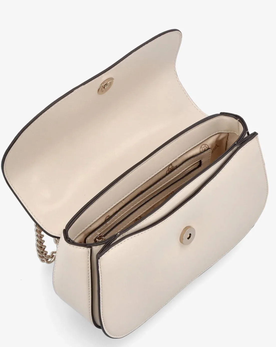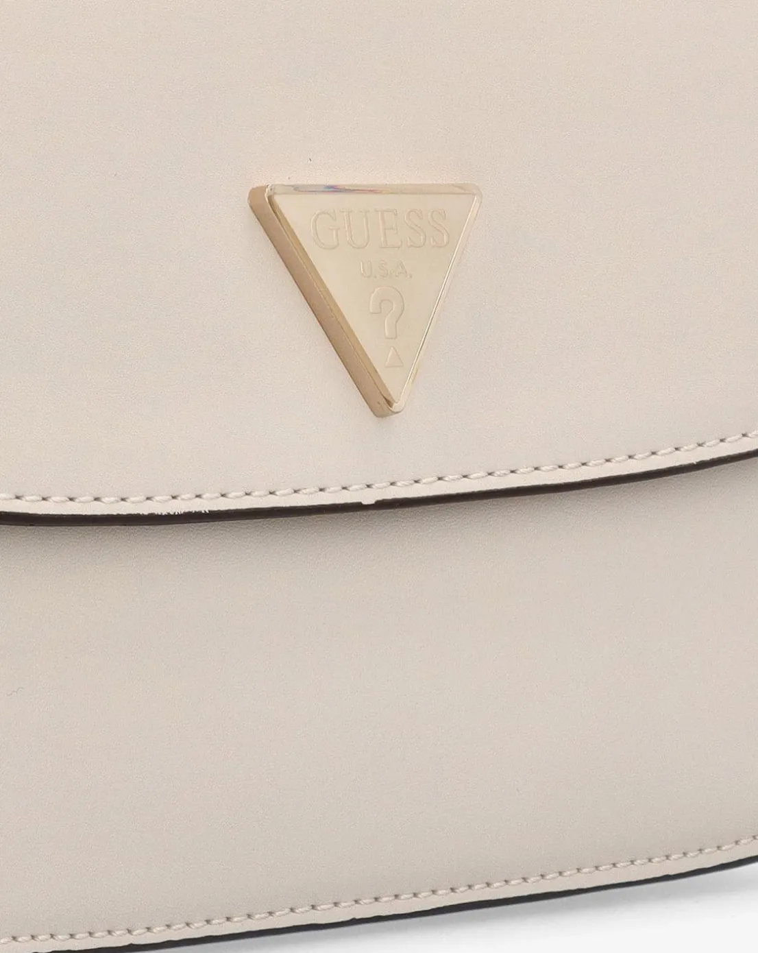 - New this season is the Guess Daryna Bone Cross-Body Bag. This everyday style is crafted from a premium smooth PU material with polished gold tone accents. The secure magnetic snap front flap allows access to the logo lined single main compartment with handy inner zip and slot pockets, exterior zipper pocket also features. Carry by the chain and PU handles on the shoulder or across the body. Detachable logo bag charm adds detail. The brand’s iconic triangle logo motif features to the front of the bag. Guess branding throughout completes the design.