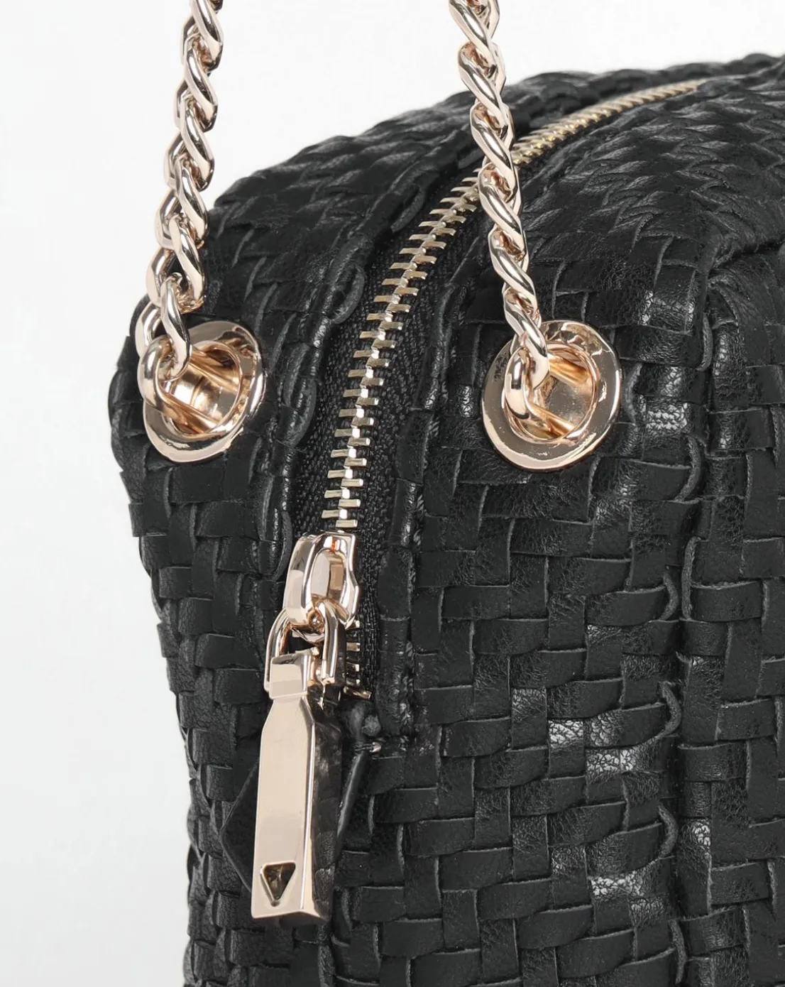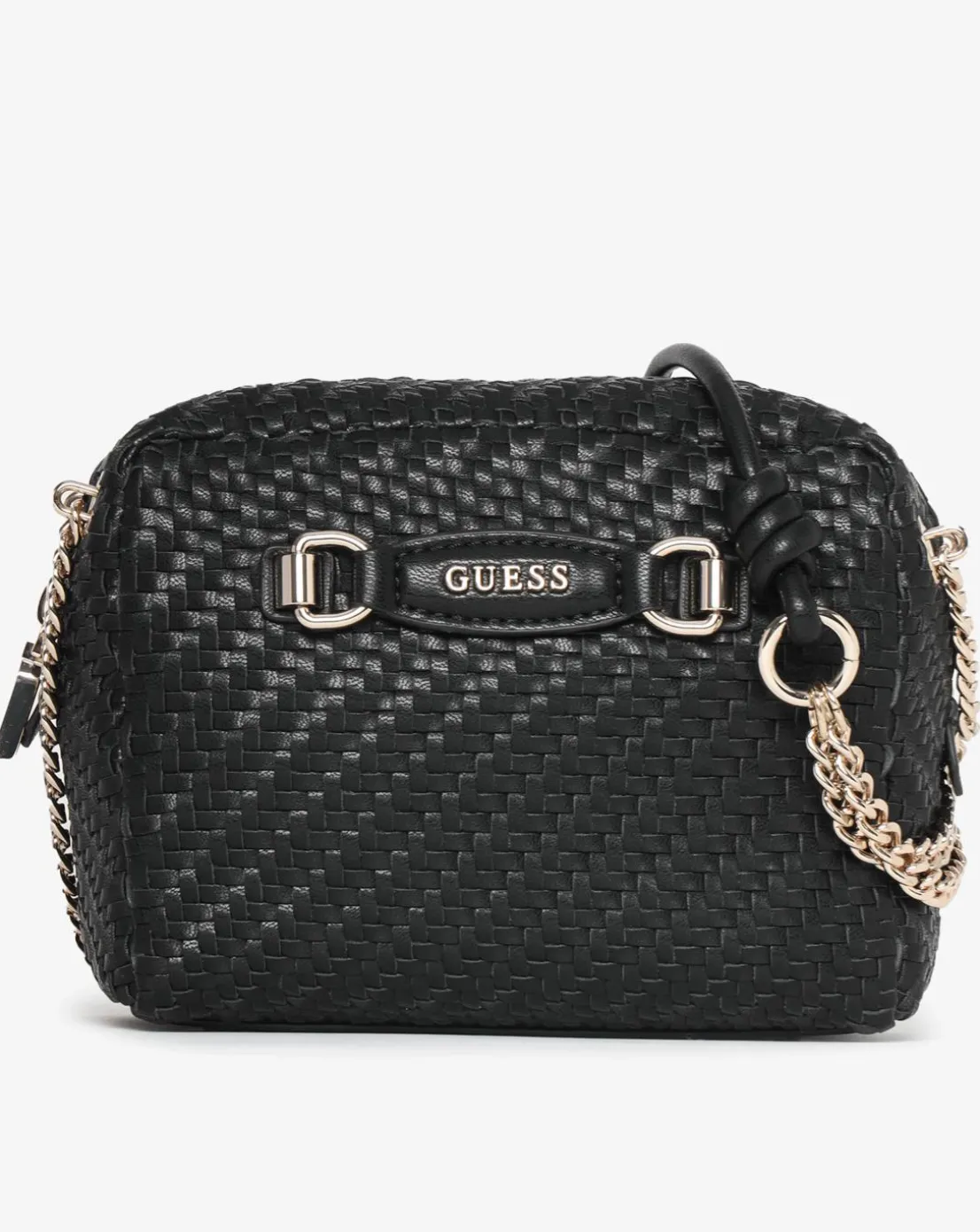 - Add the Guess Francy Woven Black Camera Cross-Body Bag to your handbag collection. This New Season style is crafted from a premium slouchy PU material in a woven design with polished gold tone accents. The secure top zip fastener allows access to the logo lined single main compartment with handy inner zip and slot pockets. Carry by the chain and PU rope style strap on the shoulder or across the body. Classic snaffle adds detail to the front of the bag. Signature GUESS branding completes the design.