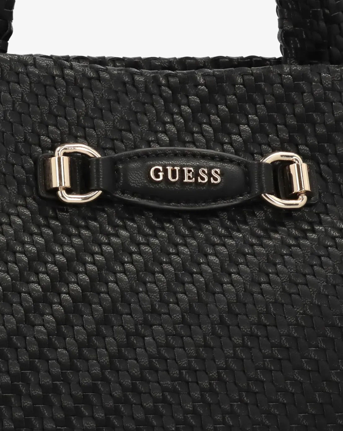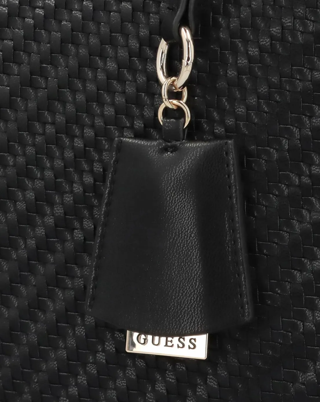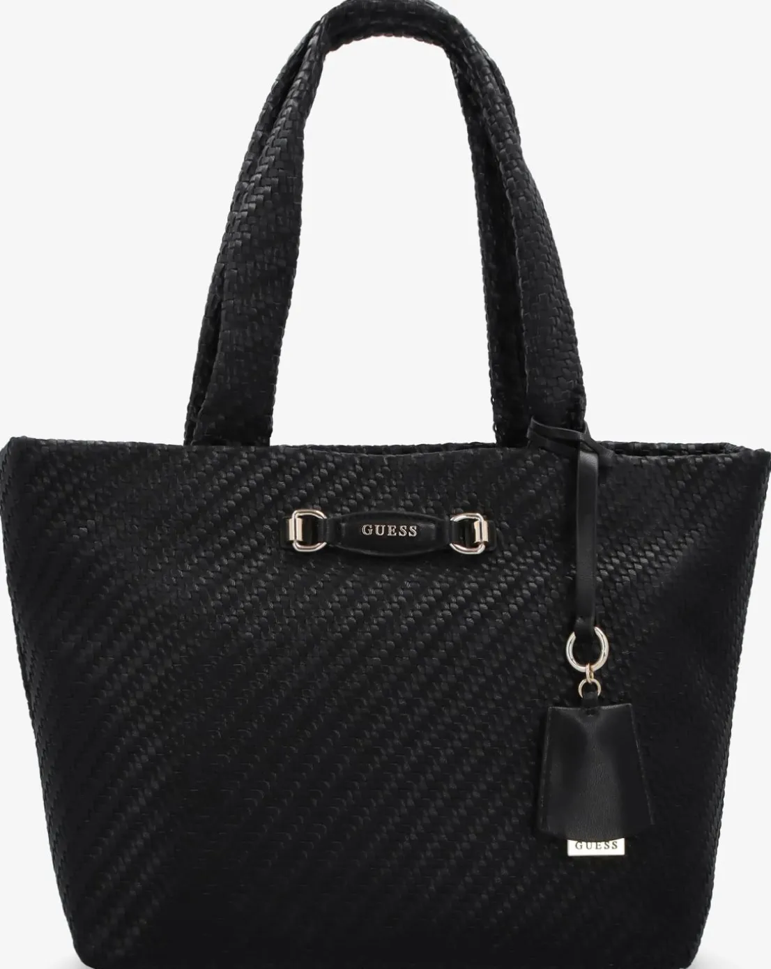 - Add the Guess Francy Woven Black Tote Bag to your handbag collection. This carryall everyday style is crafted from a premium slouchy PU material in a woven design with repeat logo textile lining and polished gold tone accents. The secure magnetic snap top strap allows access to triple compartments featuring central zip pocket as well as handy inner zip and slot pockets. Carry by the top handles on the shoulder or by hand. Classic luggage tag adds detail. Signature GUESS branding completes the design.