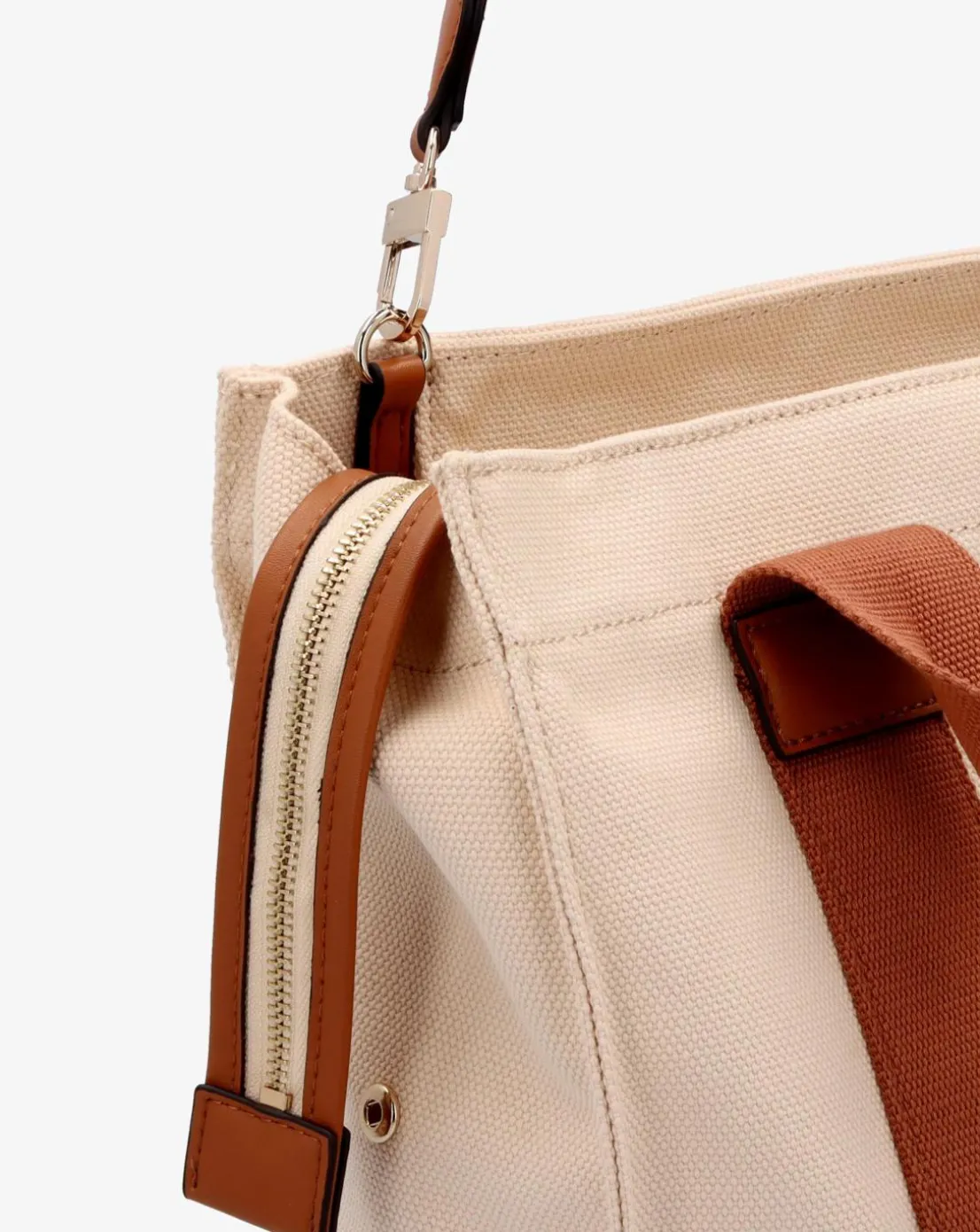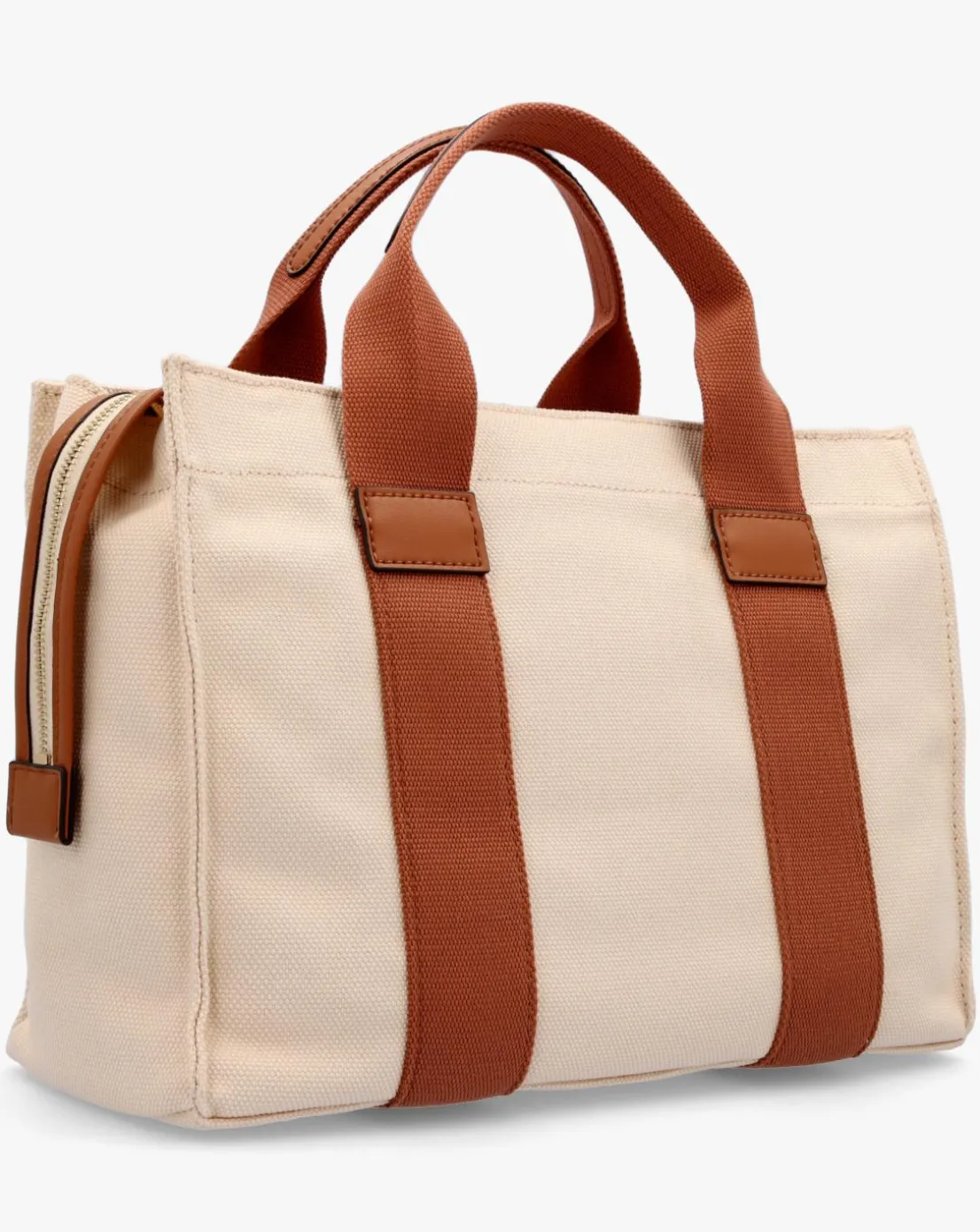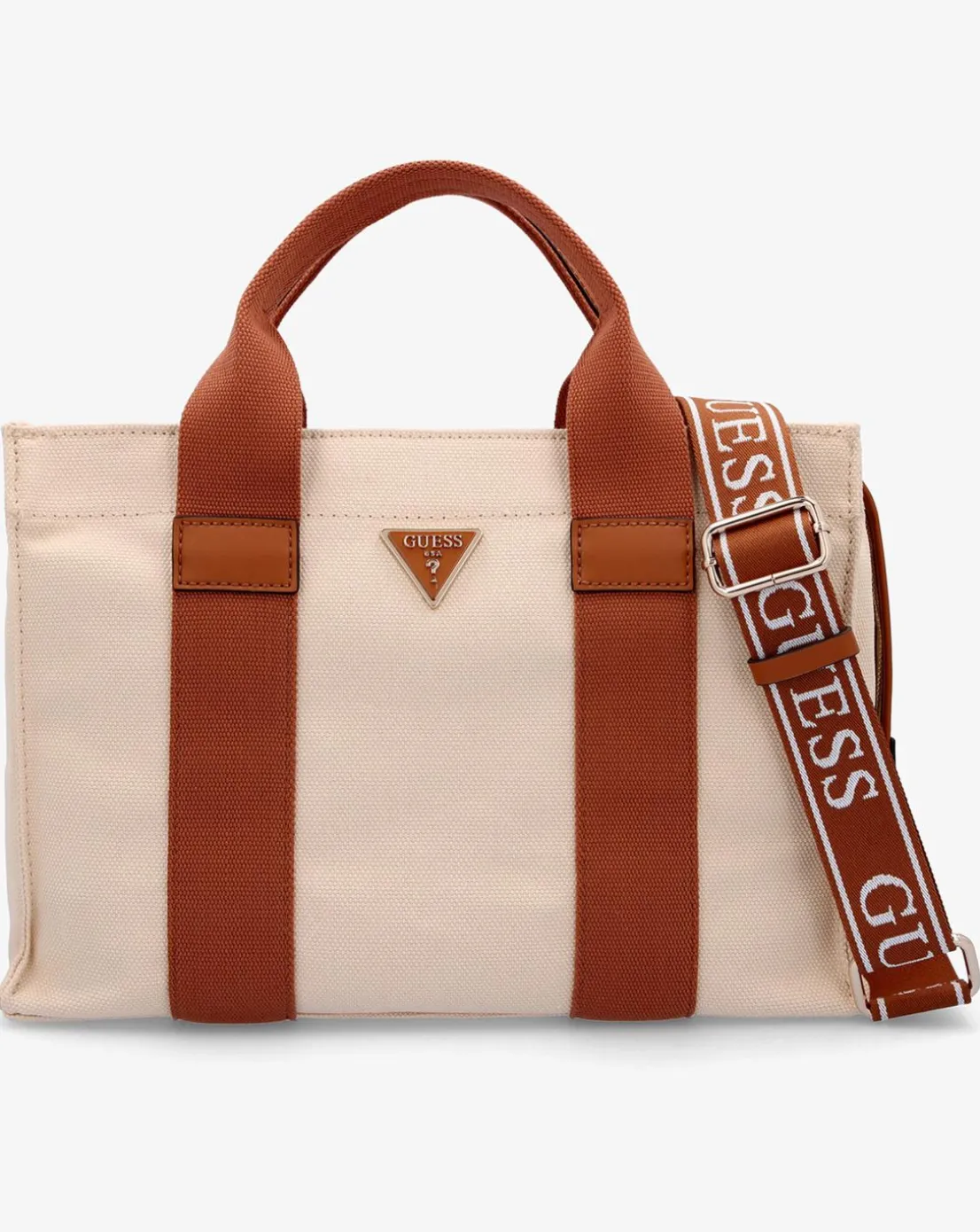 - Add the Guess Small Canvas II Natural Cognac Tote Bag to your handbag collection. This New Season lightweight Summer style is crafted from a premium canvas material with PU trim and gold tone accents. The secure top zip fastener allows access to the spacious main compartment with handy inner zip and slot pocket. Carry by the grab handles or the detachable logo guitar strap. Classic triangle logo motif adds detail. Signature GUESS branding completes the design.