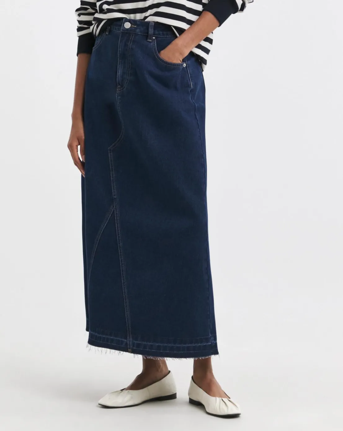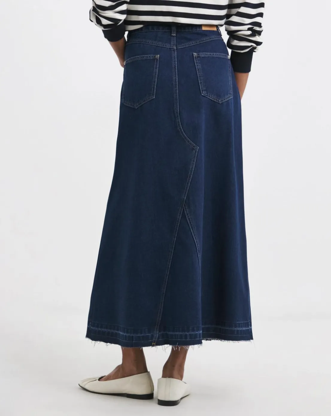 A new update on a classic style, this denim skirt now includes an added raw edge hem. Designed with ethically sourced cotton, this skirt features a flattering A line shape, maxi length and classic jean pocket detailing.