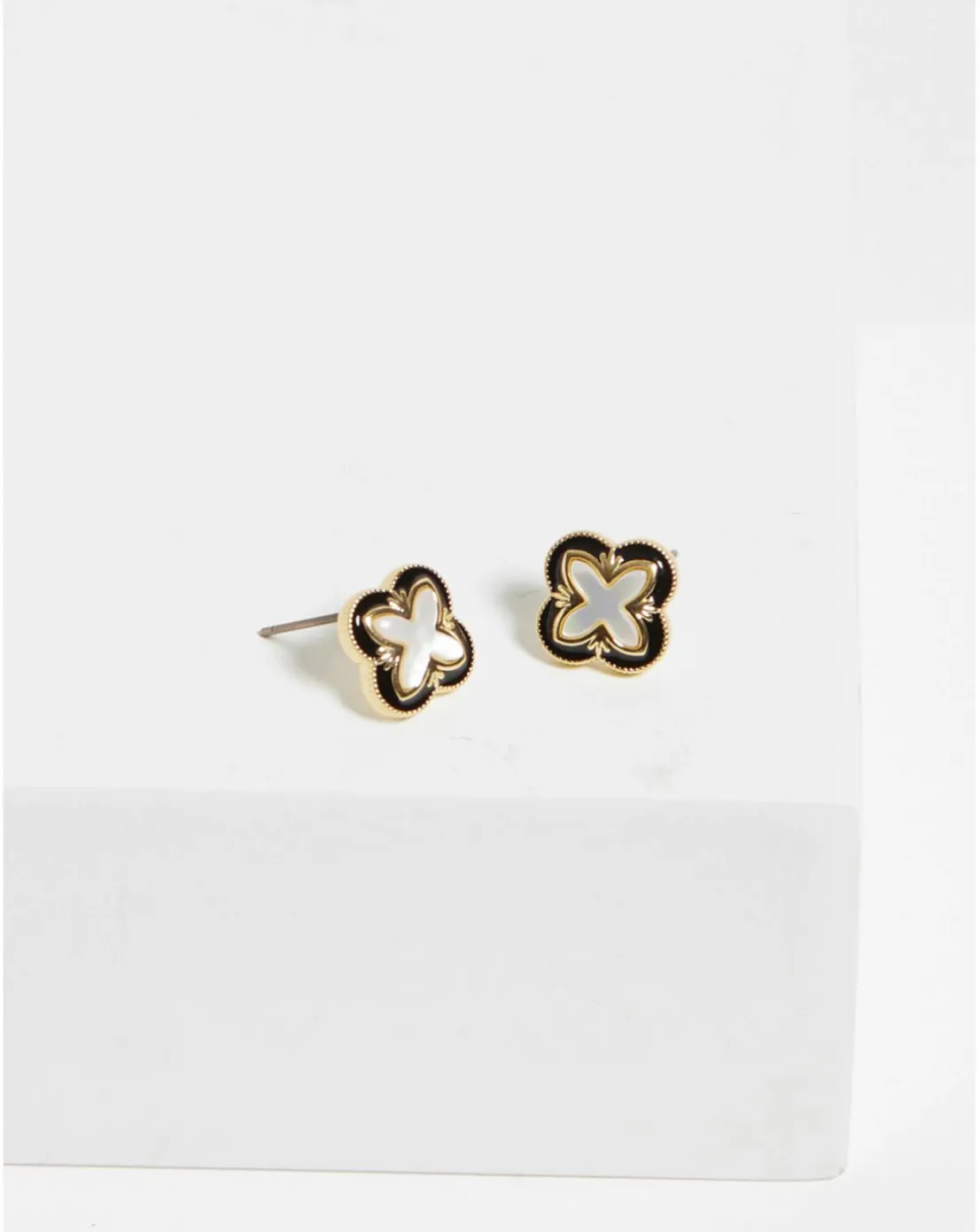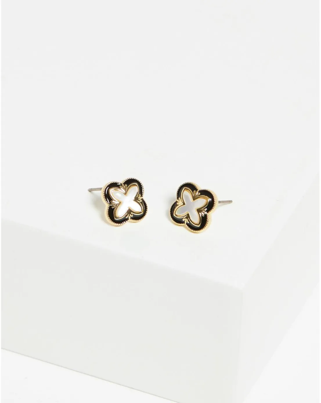 Inicio Gold Plated Jet Enamel And Mother Of Pearl Clover Earrings – Gift Pouch