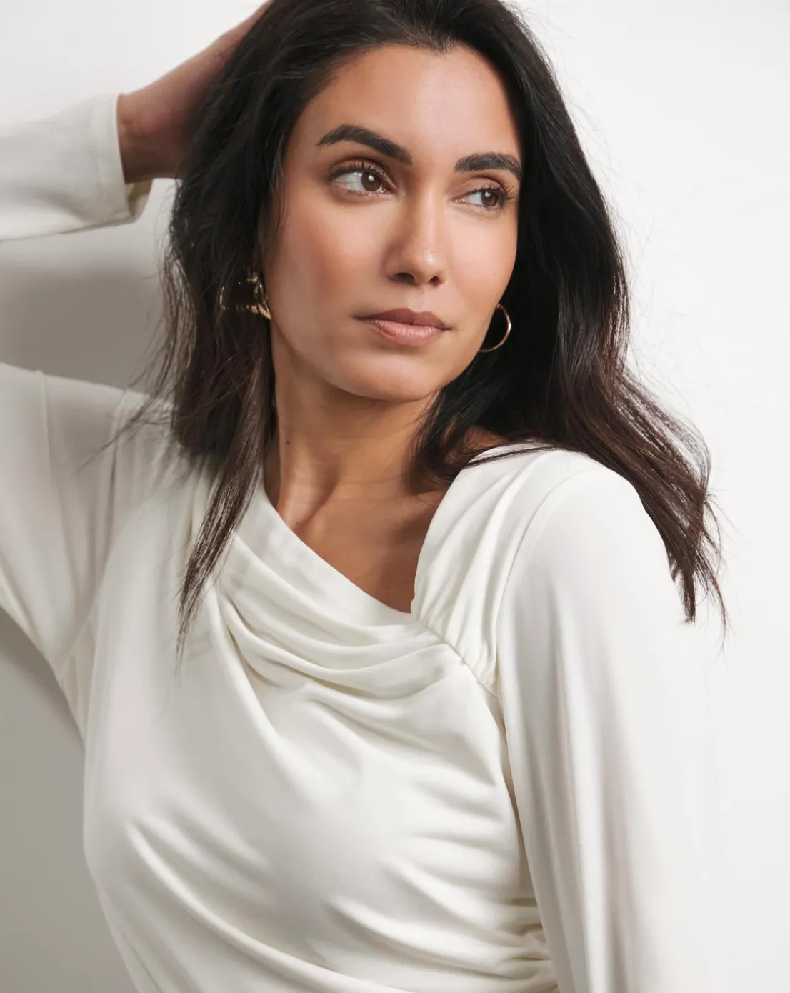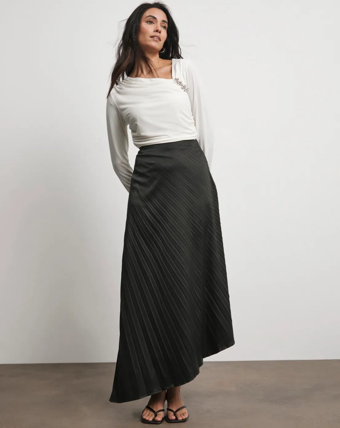 Get ready for any occasion in our Joanna Hope Jersey Top. Crafted in a modern shape with a drapped asymmetric neckline, this top comes with a metal broch that is fully detachable which is designed for versitility and ways to wear. Pair it with our gorgeous Joanna Hope pleated skirt and strappy heels for an occasion look perfect for wedding guest days and formal events.