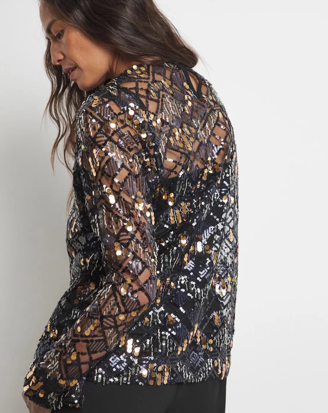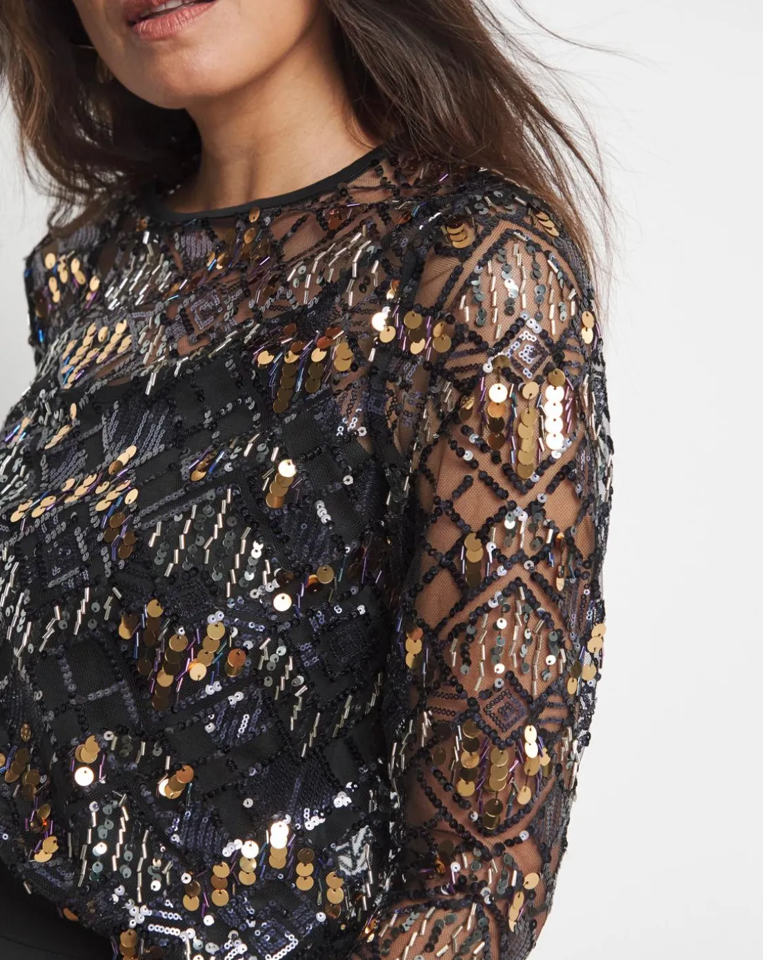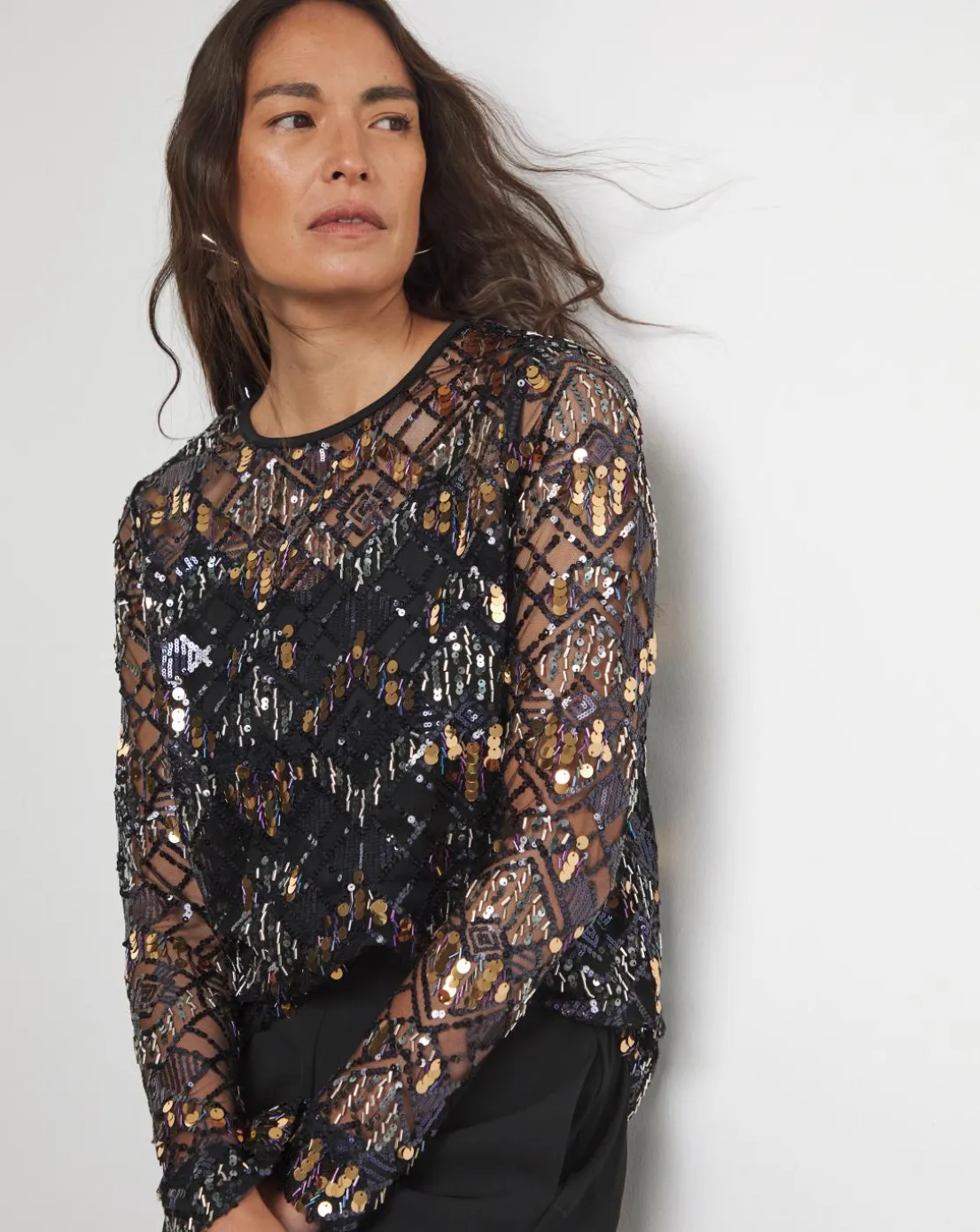 This Joanna Hope beaded top is the perfect piece to wear for an upcoming party or special event. The top features beaded embellishments, a crew neckline, a cami and long sleeves.