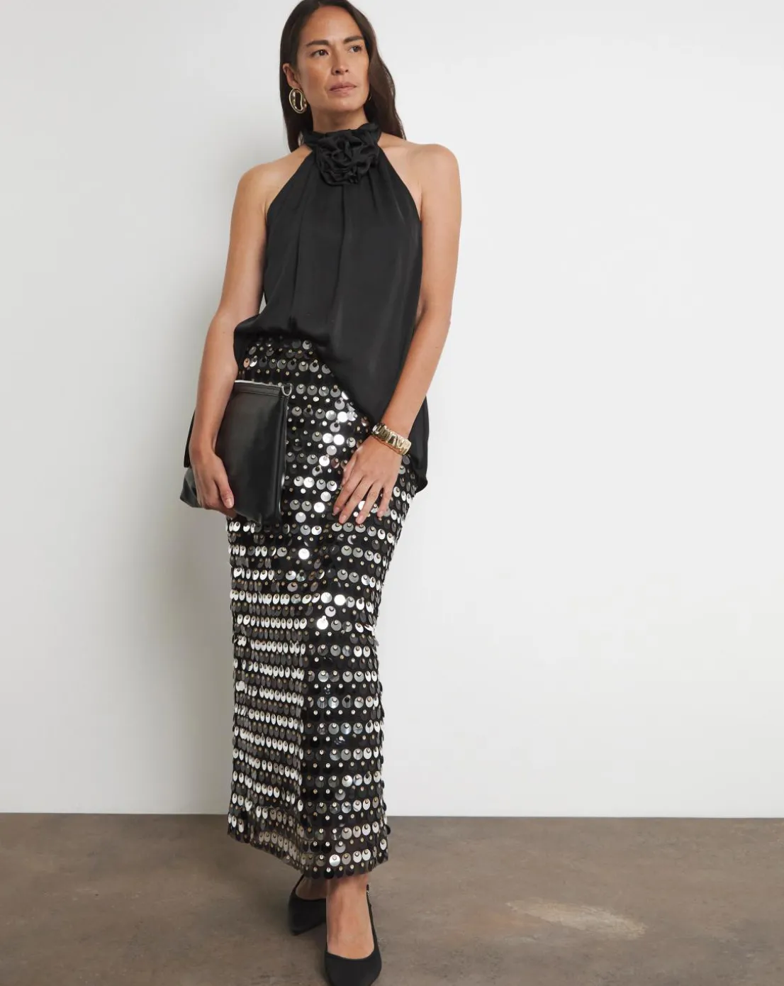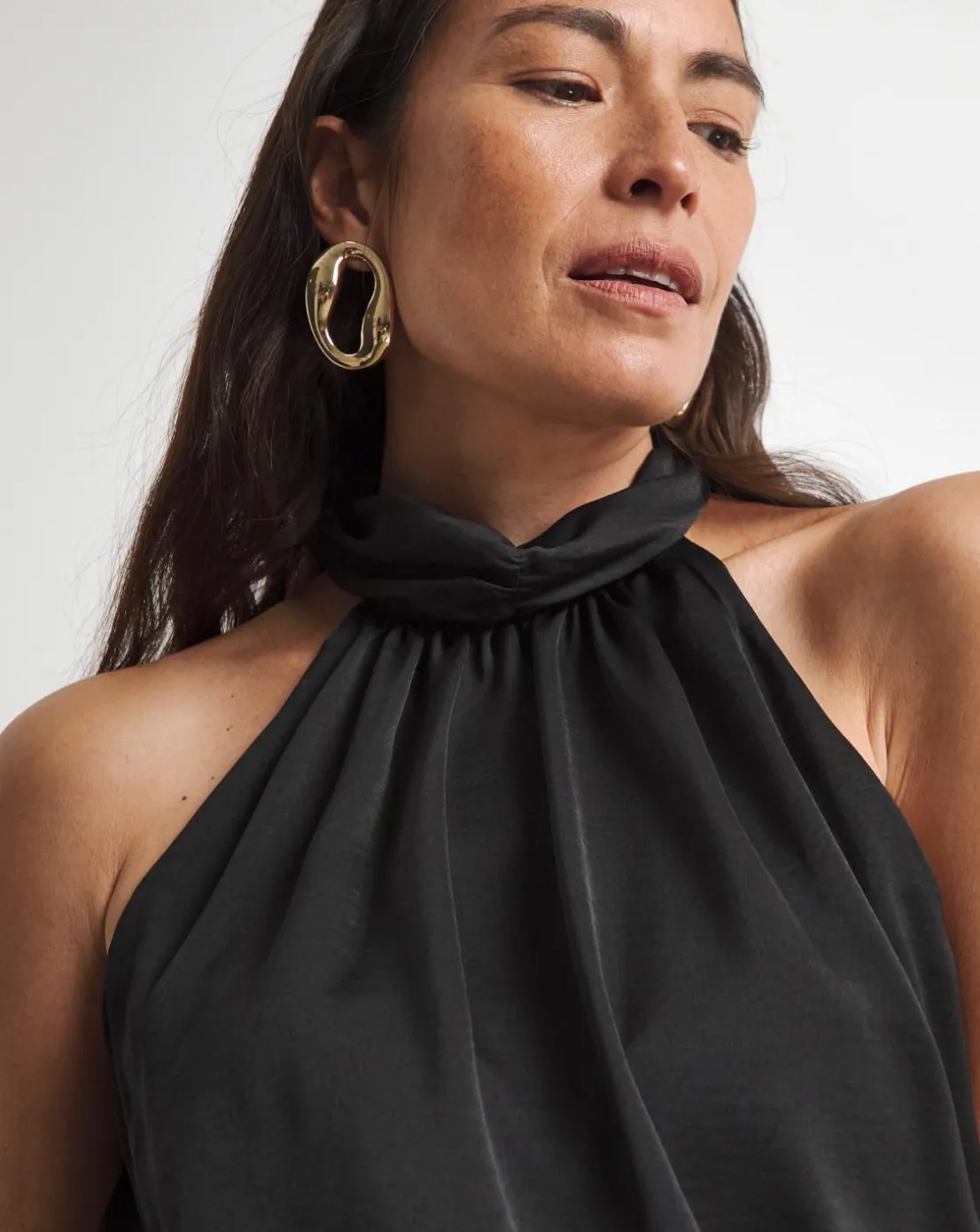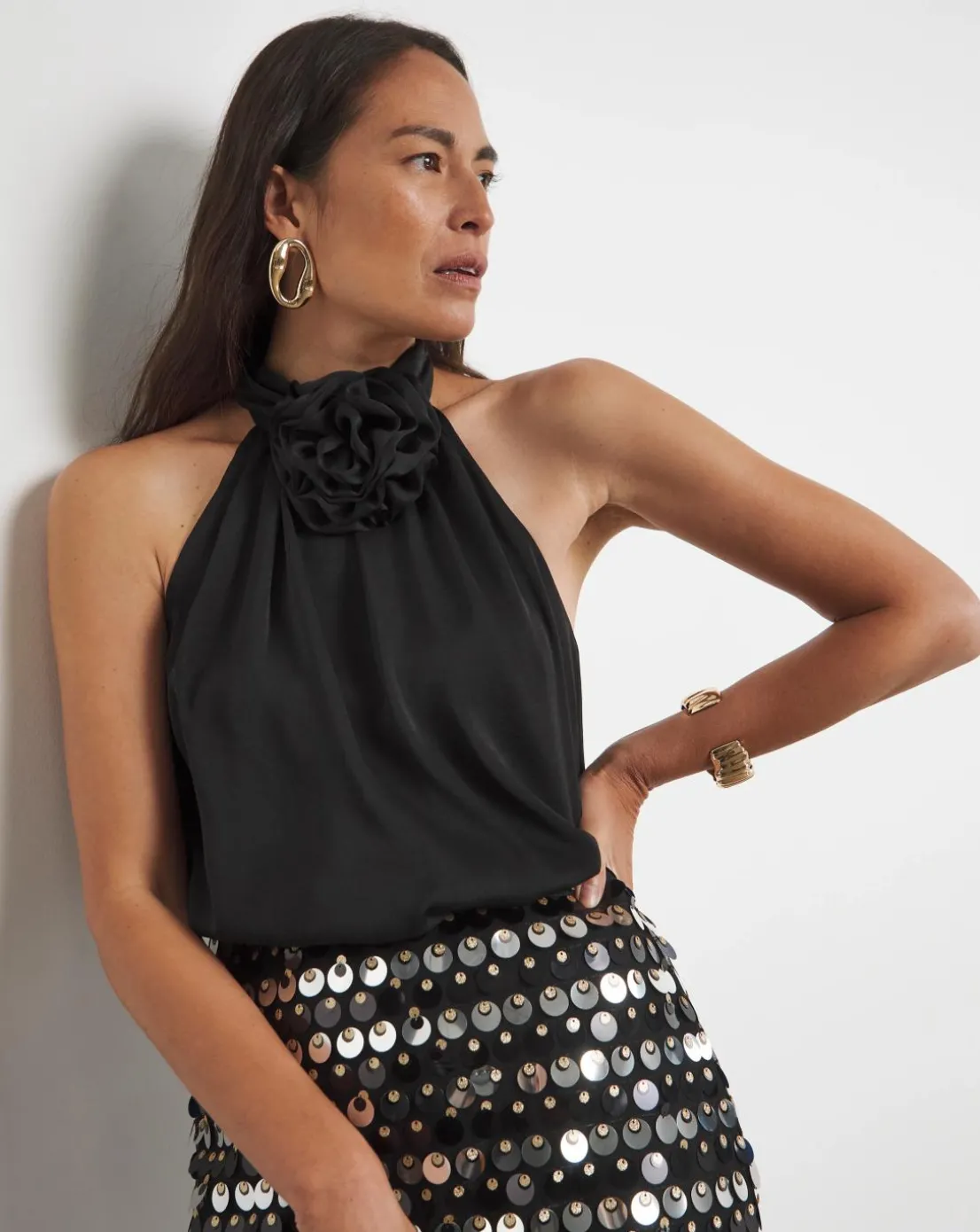 A blouse that promises an entrance, this piece is crafted from a textured matte satin that falls elegantly. The halter neck style is elevated with a fully detachable luxury corsage detail, a perfect choice for after-dark soirees.