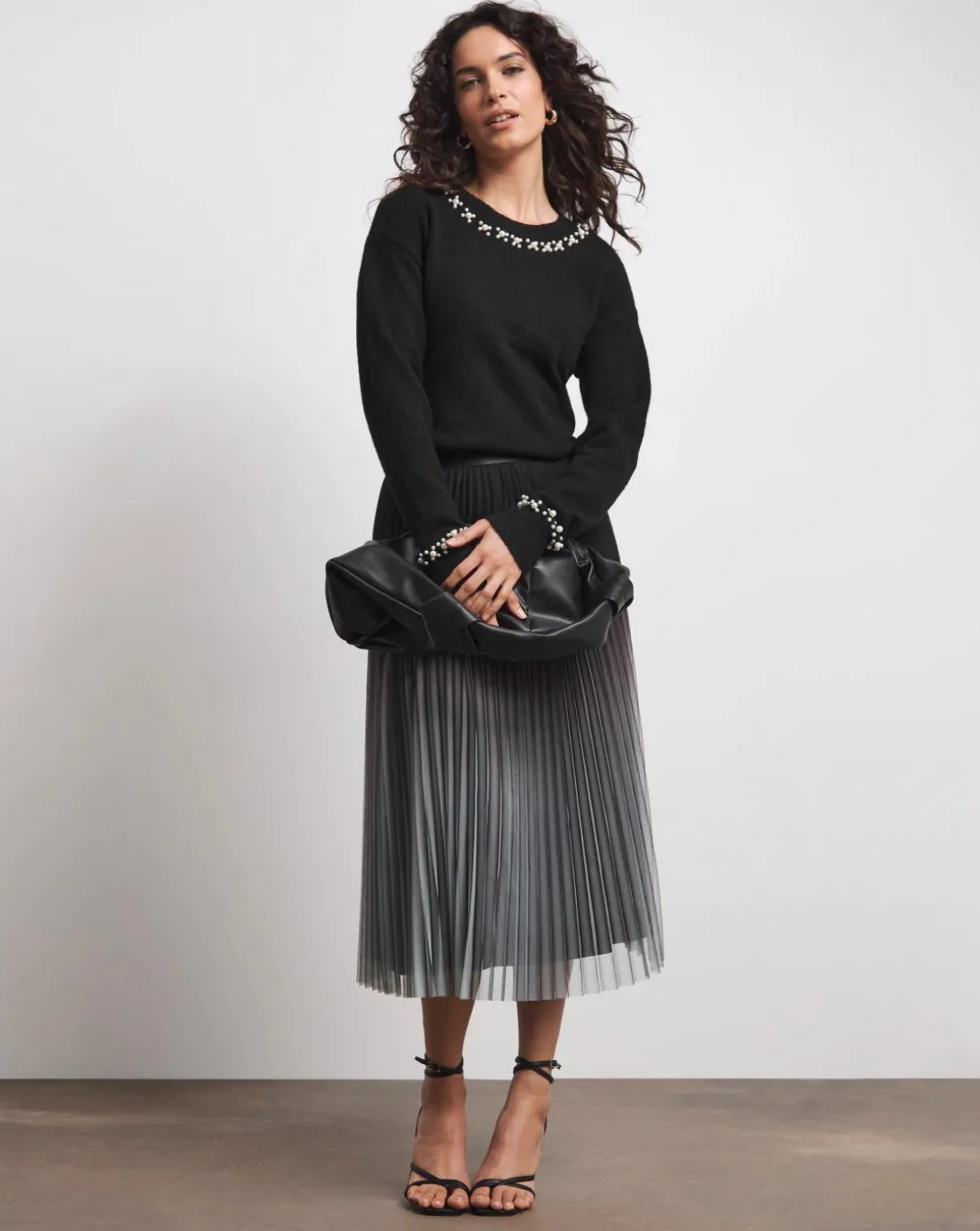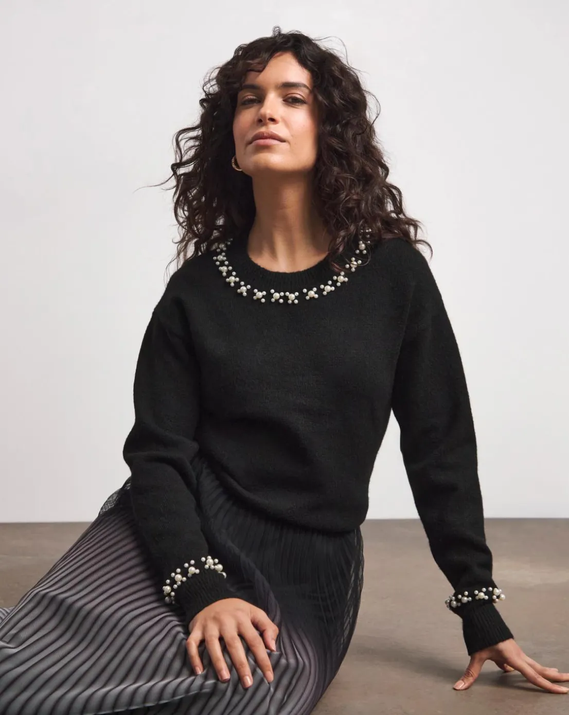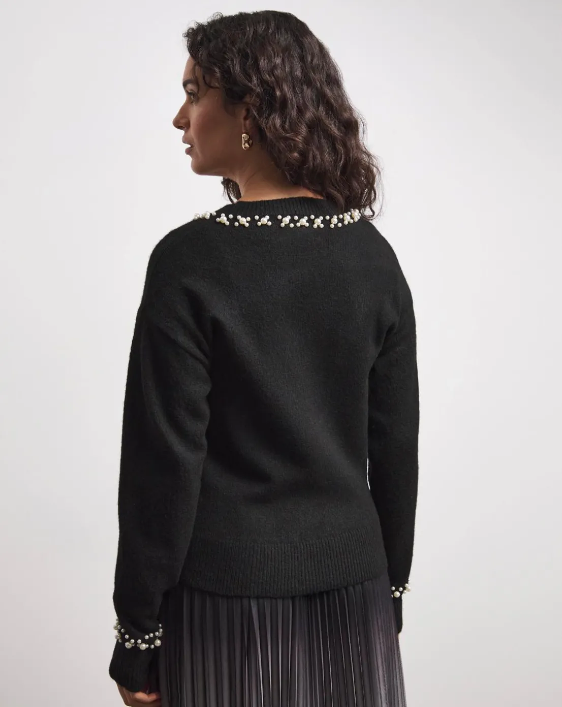 New to Joanna Hope, our pearl trim knit jumper coming in a solid black colourway. This plain black jumper has been elevated through the use of pearl detailing around the hems of the neckline and the sleeve cuffs. Pair with jeans and trainers for a casual look or dress up with a simple cami dress and heals styled underneath.