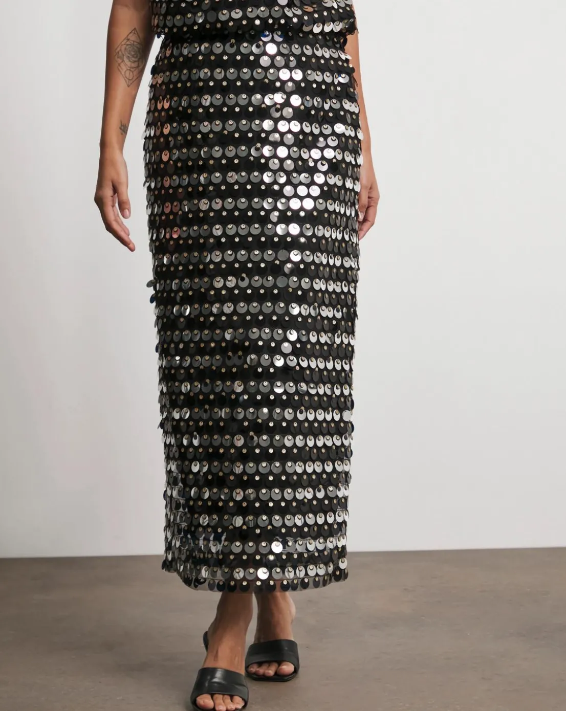 Just landed at Joanna Hope, our black and silver sequin column skirt, which is perfect for a boogie at a party or a night our with your friends. The skirt sports a straight column like shape that is embellished with silver and black sequins throughout the whole length which falls to midaxi length.