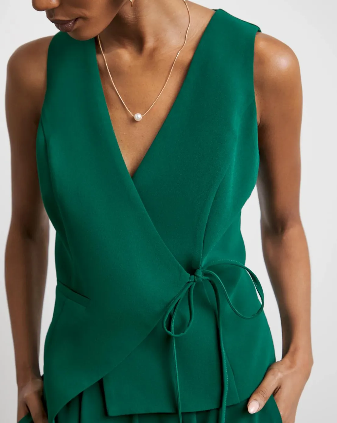 Experience ultimate tailoring with our Joanna Hope tie waistcoat in a deep forest green colourway. This waistcoat features an asymmetric design and tie details for an added effect, sleeveless arms and a v neckline. Perfect for a date night or any upcoming special occasion.