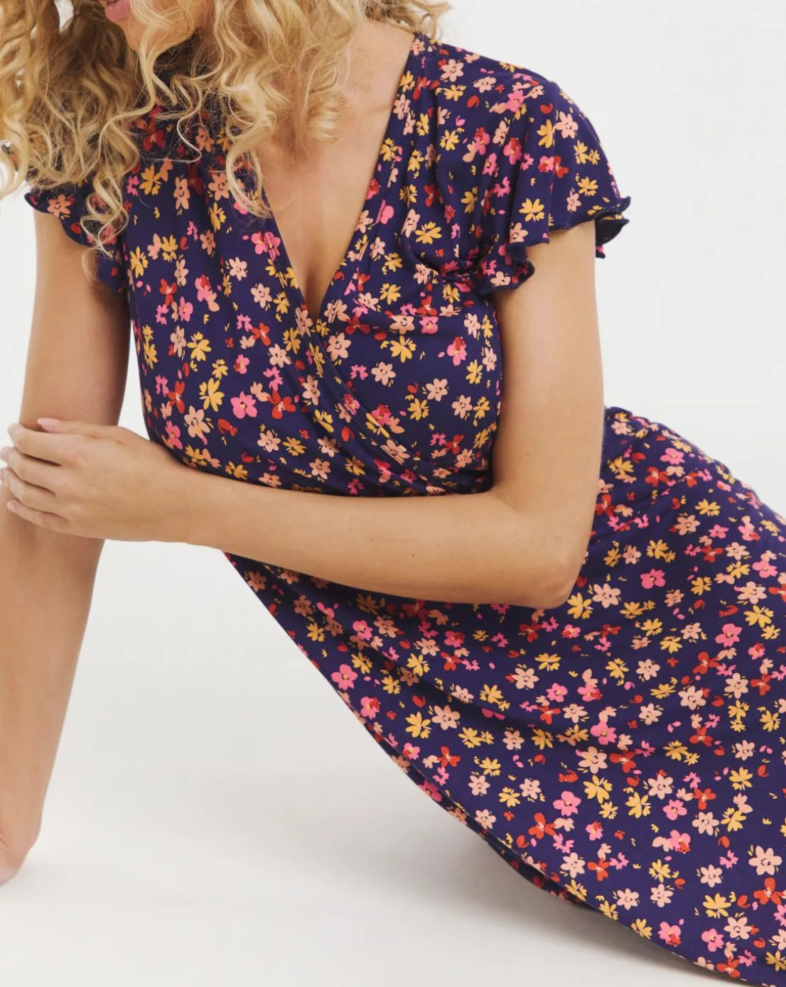 This dress is perfect for any special occasion this spring. In a vibrant, all-over floral print, this vintage inspired dress has a flattering v-neckline and stunning, flattering ruffle sleeves.