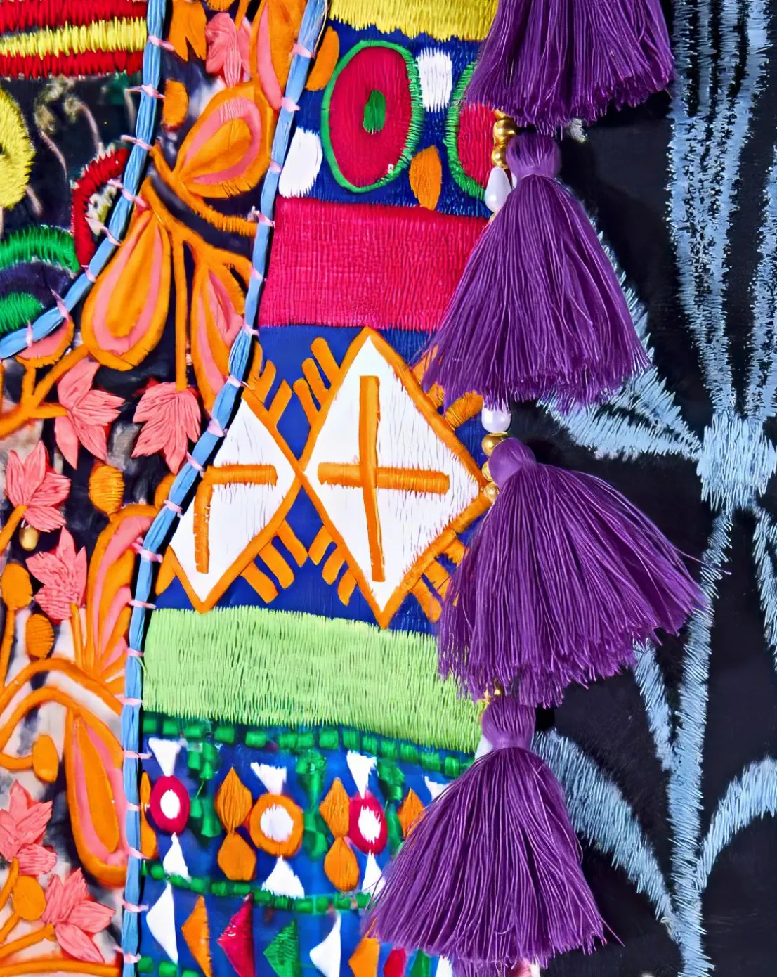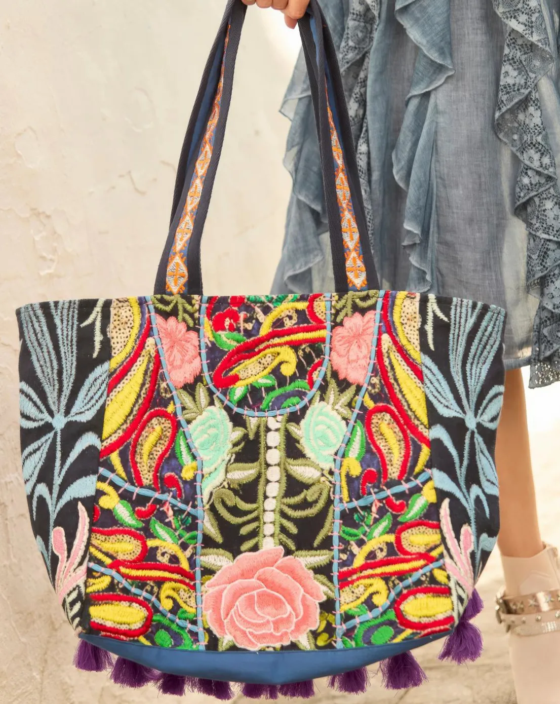 One glance at the embriodery on this tassel trim tote bag, and it’ll have you captivated!