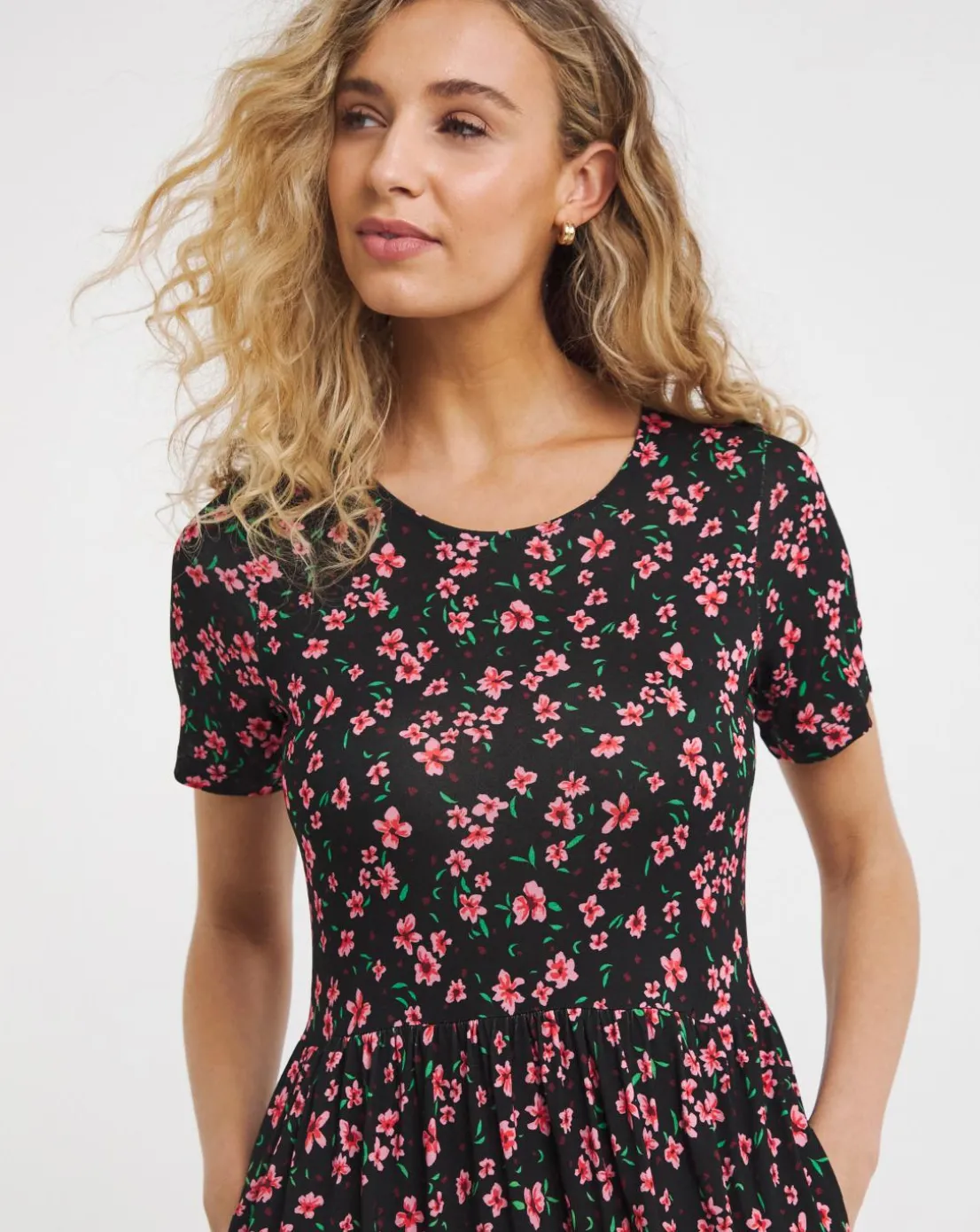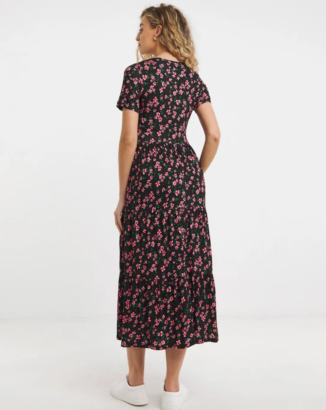 Comfortable & easy to wear, this jersey midi dress will become your go-to summer dress with it’s pockets & soft fabric. In a perfect dark based print with pretty in pink flowers & tiered silhouette will give you the confidence to step out & feel fabulous.