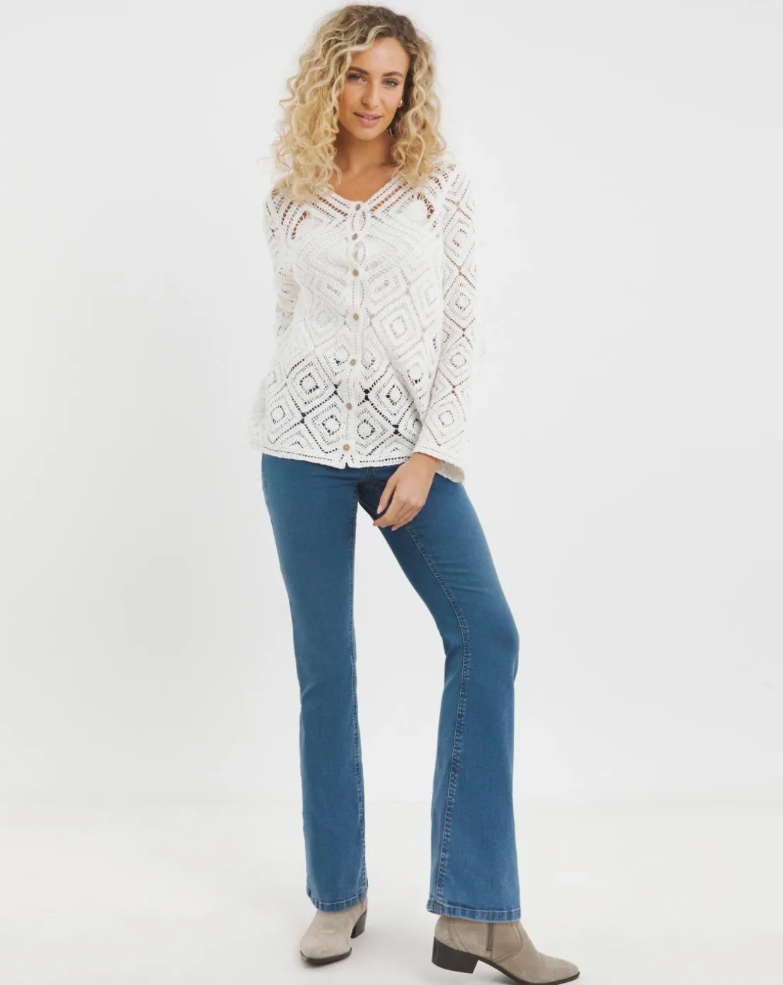 This delicate crochet cardigan with a scoop neck is the ultimate boho- inspired piece will become your go-to piece to elevate any outfit this summer. Pair with one of our Joe Browns camis and shorts or jeans, there’s so many ways to wear this piece. Crochet cardigan. Long sleeves. Lightweight yarn. Scoop neckline