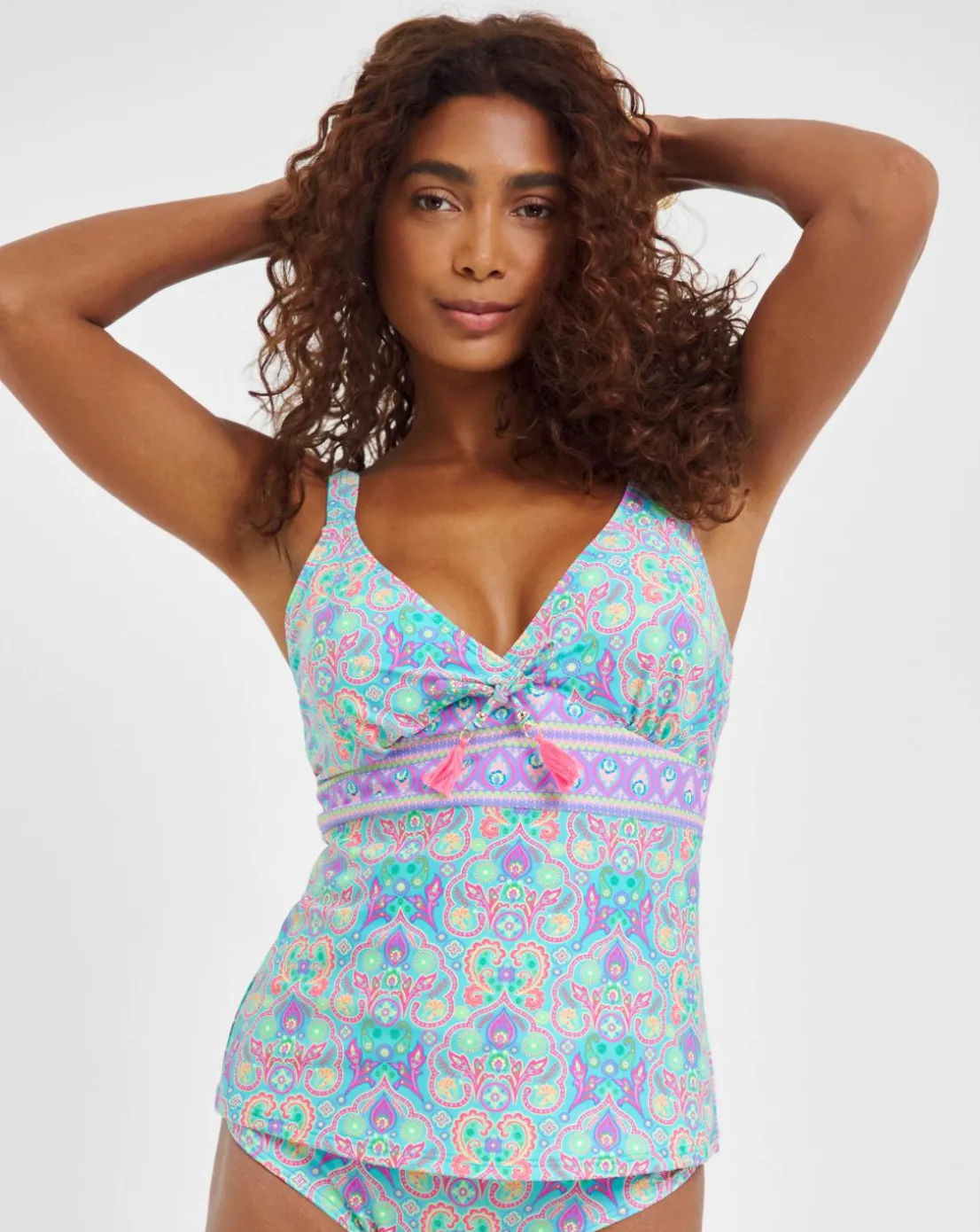 Bringing Summer vibes with its vibrant paisley print, our Paradise Cove tankini top with its contrast border print and playful tassel trim is all you need to get ready for a week of sun, sea and sand. Non-wired, padded, plunge neckline (Pads are removeable). Back fastening and adjustable straps. Just don’t forget to add one of our matching swimwear pieces for the full fabulous look.